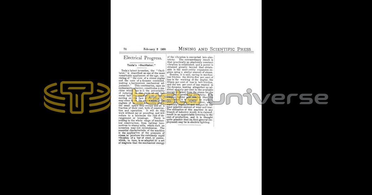 Tesla's latest invention, the "Oscillator," is described as one of the most remarkable appliances of the age, consisting of "the core of a steam engine and the core of a dynamo combined, making a harmonious mechanical adjustment." This combination, says an enthusiastic admirer, constitutes a machine which has in it the potentiality of reducing to the rank of old bell metal half the machinery at present moving on the face of the globe. It may come to do the entire work of the engines of an ocean steamship within the small space they occupy and at a fraction of their cost, both of construction and operation. It will do this work without jar or pounding, and will reduce to a minimum the risk of derangement or breakage. There is nothing in the whole range of mechanical construction, from railway locomotives to stamp mills, which such an invention may not revolutionize. The essential characteristic of the machine is the application of the pressure of steam to produce the extremely rapid vibration of a bar of steel, or piston, which, in turn, is so adapted to a set of magnets that the mechanical energy of the vibration is converted into electricity. The extraordinary result is that practically an absolutely constant vibration is established, and a power is obtained greatly beyond that obtainable in the most costly expansion engines using a similar amount of steam.