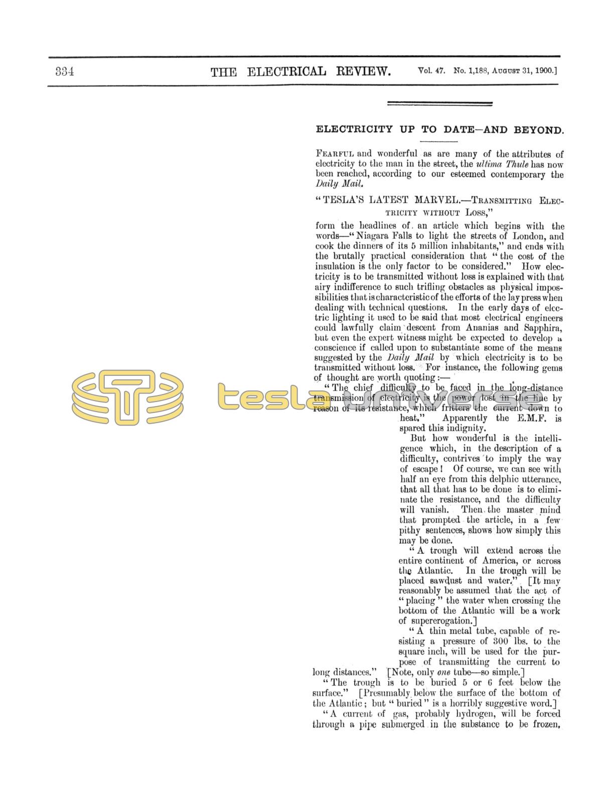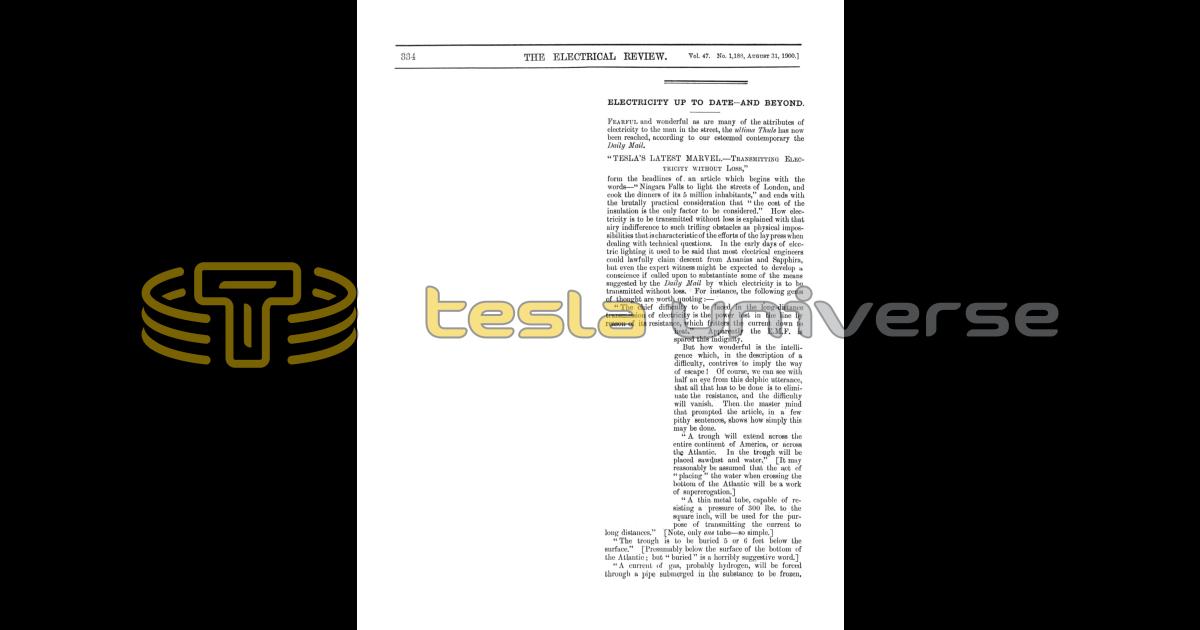 The Daily Mail, in concluding, points out that, “by Mr. Tesla's invention, there is now practically no limit to the distance to which electricity may be conveyed.”