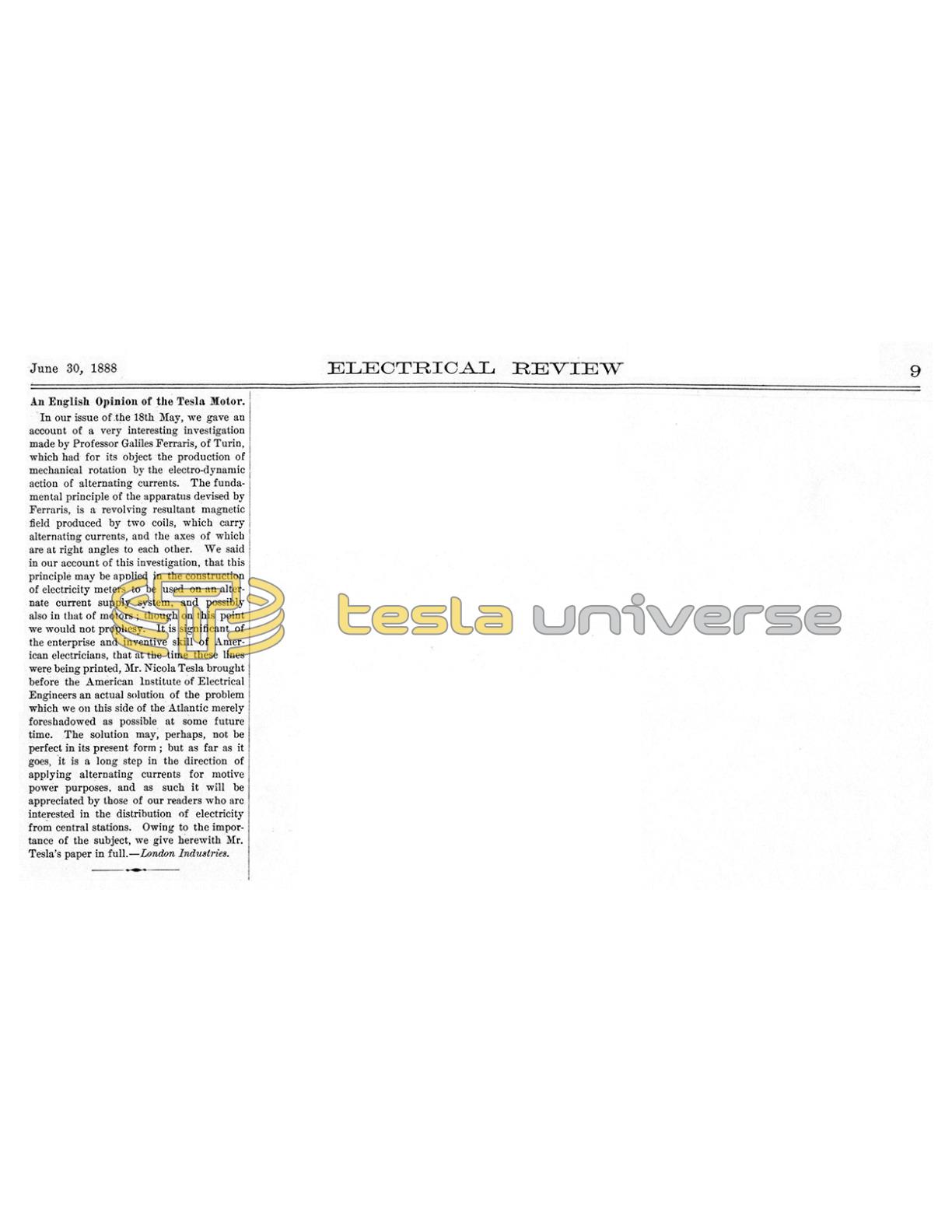 In our issue of the 18th May, we gave an account of a very interesting investigation made by Professor Galiles Ferraris, of Turin, which had for its object the production of mechanical rotation by the electro-dynamic action of alternating currents. The fundamental principle of the apparatus devised by Ferraris, is a revolving resultant magnetic field produced by two coils, which carry alternating currents, and the axes of which are at right angles to each other. We said in our account of this investigation, that this principle may be applied in the construction of electricity meters to be used on an alternate current supply system, and possibly also in that of motors; though on this point we would not prophesy. It is significant of the enterprise and inventive skill of American electricians, that at the time these lines were being printed, Mr. Nicola [sic] Tesla brought before the American Institute of Electrical Engineers an actual solution of the problem which we on this side of the Atlantic merely foreshadowed as possible at some future time. The solution may, perhaps, not be perfect in its present form; but as far as it goes, it is a long step in the direction of applying alternating currents for motive power purposes, and as such it will be appreciated by those of our readers who are interested in the distribution of electricity from central stations. Owing to the importance of the subject, we give herewith Mr. Tesla's paper in full. - London Industries.