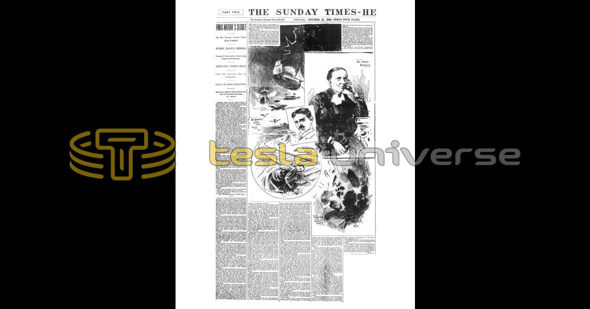 Detroit, Mich., Oct. 24. Nikola Tesla: — I have discovered the hiding place of universal force, of that most vital and terrible thing. the fountain of pure electrical fluld.