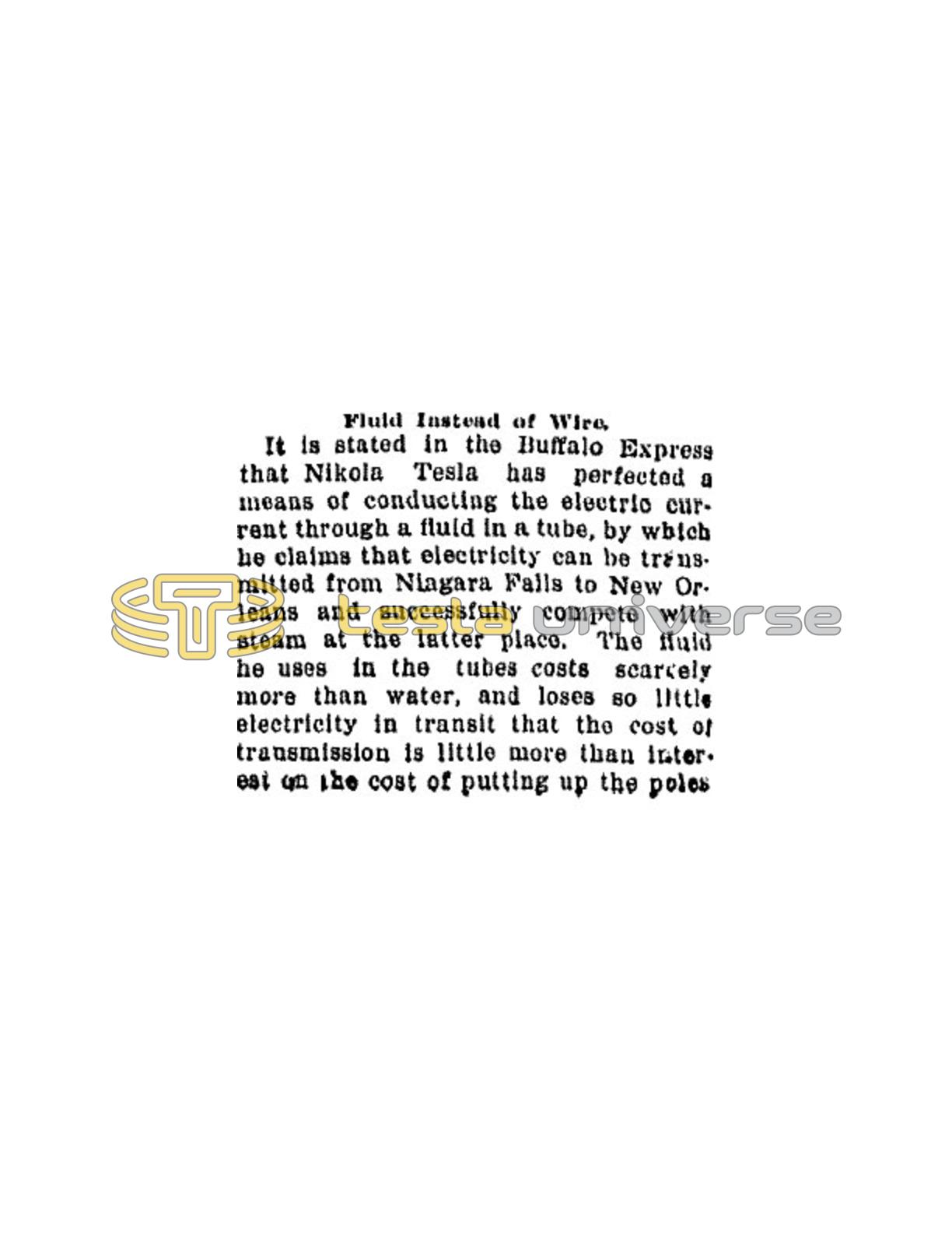 It is stated in the Buffalo Express that Nikola Tesla has perfected a means of conducting the electric current through a fluid in a tube, by which he claims that electricity can be transmitted from Niagara Falls to New Orleans and successfully compete with steam at the latter place. The fluid he uses in the tubes costs scarcely more than water, and loses so little electricity in transit that the cost of transmission is little more than interest on the cost of putting up the poles.