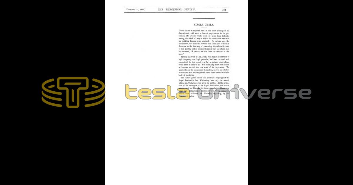 The lecture given before the Electrical Engineers at the Royal Institution last Wednesday, was only the second which Mr. Tesla had ever given in public. At the invitation of the managers of the Royal Institution, the lecture was repeated on Thursday to its own members. There were large and distinguished audiences upon both occasions, which were enlivened, on Thursday especially, by the presence of ladies.