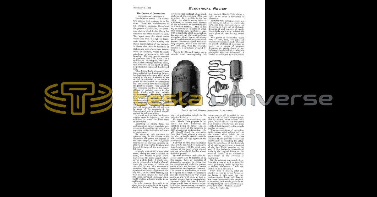 Thus Nikola Tesla, a learned American, a rival of the illustrious Edison, has just made a discovery which, when applied to the art of warfare on sea or land, is to furnish to the armies a power of destruction so formidable that one scarcely dares to contemplate its practical results. The secret of this discovery resides in the transmission of electrical energy to distances which, until now, nobody could surmise. By simple atmospheric conduction, and without any wire whatever, the current is to traverse thousands of kilometers, bring mourning and desolation and carry death, silently, invisibly, into the ranks of the enemy, who will not even be aware of the approach of the Camarde and able to defend himself against its unforeseen blow.