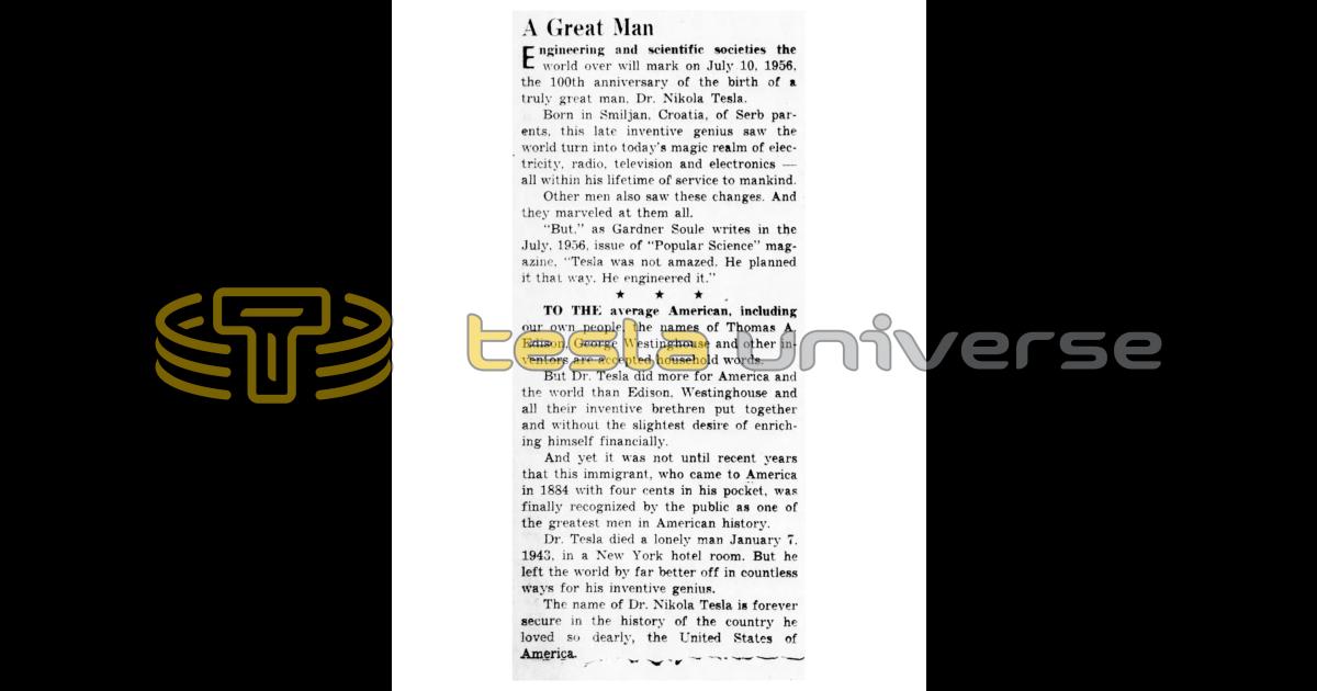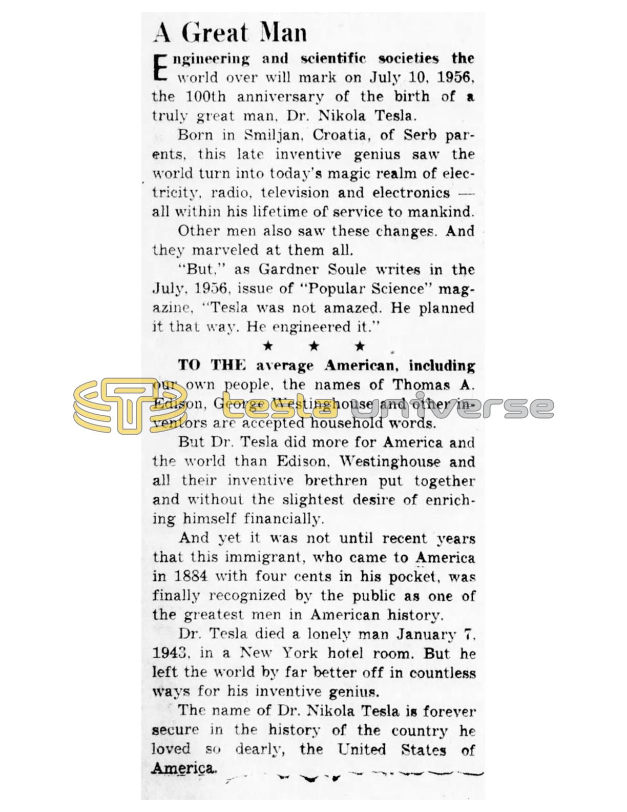 Engineering and scientific societies the world over will mark on July 10, 1956, the 100th anniversary of the birth of a truly great man, Dr. Nikola Tesla.