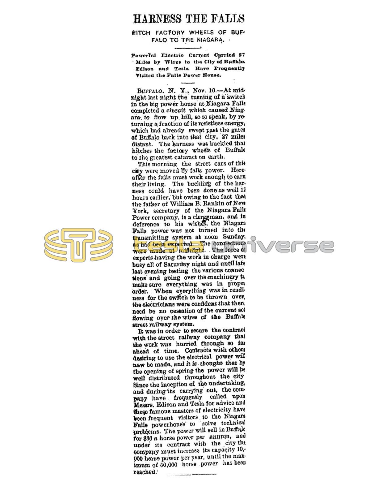 This morning the street cars of this city were moved by falls power. Hereafter the falls must work enough to earn their living. The buckling of the harness could have been done as well 12 hours earlier, but owing to the fact that the father of William B. Rankin of New York, secretary of the Niagara Fall Power company, is a clergyman, and in deference to his wishes, the Niagara Falls power was not turned into the transmitting system at noon Sunday, as had been expected. The connections were made at midnight. The force of experts having the work in charge were busy all of Saturday night and until late last evening testing the various connections and going over the machinery to make sure everything was in proper order. When everything was in readiness for the switch to be thrown over, the electricians were confident that there need be no cessation of the current set flowing over the wires of the Buffalo street railway system.