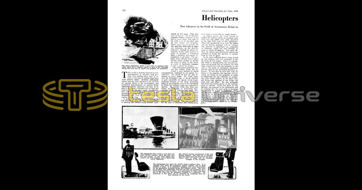 The well known electrical wizard, Dr. Nikola Tesla, has invented a new method of aerial transportation, explained in his patent No. 1,655,113. The details of this are also indicated on these pages. Dr. Tesla states that the helicopter type of flying machine is quite unsuitable for speedy aerial transportation because of the large inclination angle of the propeller axis to the horizontal at which the ordinary types are expected to operate. He further holds that these machines are incapable of proceeding horizontally along a straight line under prevailing air conditions, that they are subject to plunges and oscillations, and almost certain to be doomed to destruction in case the motive power gives out. In his own system, the construction is composed of two planes rigidly joined. The tail is omitted for the sake of smallness and compactness, or if used, is retractable by simple means.