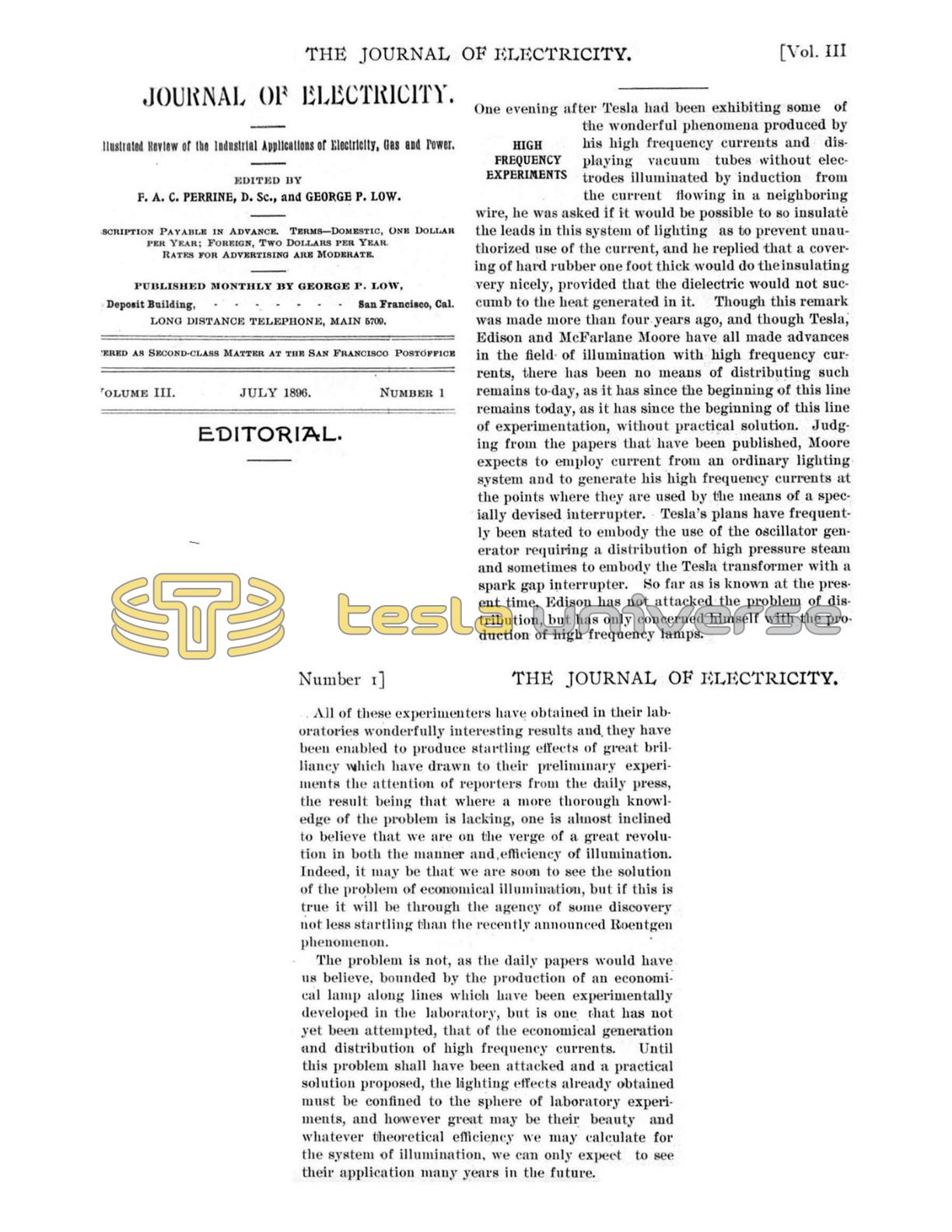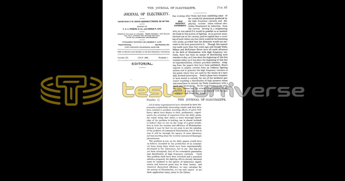 One evening after Tesla had been exhibiting some of the wonderful phenomena produced by his high frequency currents and displaying vacuum tubes without electrodes illuminated by induction from the current flowing in a neighboring wire, he was asked if it would be possible to so insulate the leads in this system of lighting as to prevent unauthorized use of the current, and he replied that a covering of hard rubber one foot thick would do the insulating very nicely, provided that the dielectric would not succumb to the heat generated in it. Though this remark was made more than four years ago, and though Tesla, Edison and McFarlane Moore have all made advances in the field of illumination with high frequency currents, there has been no means of distributing such remains to-day, as it has since the beginning of this line remains today, as it has since the beginning of this line of experimentation, without practical solution. Judg. ing from the papers that have been published, Moore expects to employ current from an ordinary lighting. system and to generate his high frequency currents at the points where they are used by the means of a specially devised interrupter. Tesla's plans have frequently been stated to embody the use of the oscillator generator requiring a distribution of high pressure steam and sometimes to embody the Tesla transformer with a spark gap interrupter. So far as is known at the present time, Edison has not attacked the problem of distribution, but has only concerned himself with the production of high frequency lamps. .. All of these experimenters have obtained in their laboratories wonderfully interesting results and they have been enabled to produce startling effects of great brilliancy which have drawn to their preliminary experiments the attention of reporters from the daily press, the result being that where a more thorough knowledge of the problem is lacking, one is almost inclined to believe that we are on the verge of a great revolution in both the manner and, efficiency of illumination. Indeed, it may be that we are soon to see the solution of the problem of economical illumination, but if this is true it will be through the agency of some discovery not less startling than the recently announced Roentgen phenomenon. The problem is not, as the daily papers would have us believe, bounded by the production of an economical lamp along lines which have been experimentally developed in the laboratory, but is one that has not yet been attempted, that of the economical generation and distribution of high frequency currents. Until this problem shall have been attacked and a practical solution proposed, the lighting effects already obtained must be confined to the sphere of laboratory experiments, and however great may be their beauty and whatever theoretical efficiency we may calculate for the system of illumination, we can only expect to see their application many years in the future.