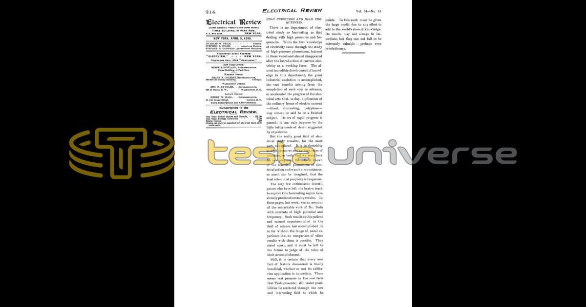 Still; it is certain that every new fact of Nature discovered is finally beneficial, whether or not its utilitarian application is immediate. There seems vast promise in the new facts that Tesla presents; still vaster possibilities lie scattered through the new and interesting field to which he points. To this work must be given the large credit due to any effort to add to the world’s store of knowledge. Its results may not always be immediate, but they can not fail to be extremely valuable - perhaps even revolutionary.