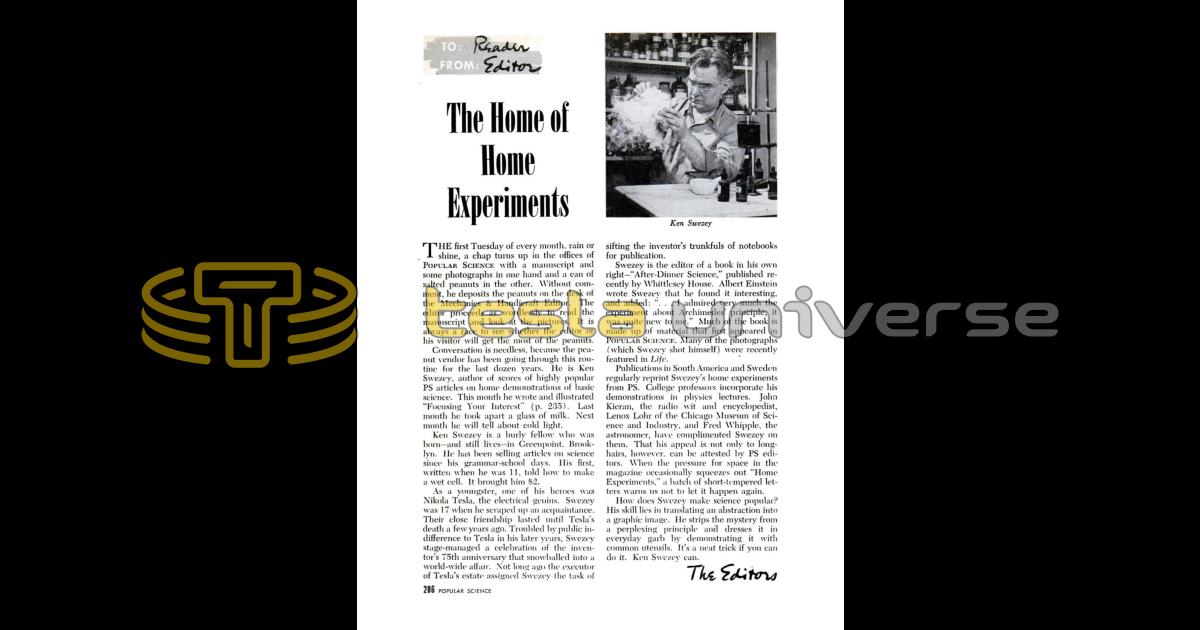 As a youngster, one of his heroes was Nikola Tesla, the electrical genius. Swezey was 17 when he scraped up an acquaintance. Their close friendship lasted until Tesla's death a few years ago. Troubled by public indifference to Tesla in his later years, Swezey stage-managed a celebration of the inventor's 75th anniversary that snowballed into a world-wide affair. Not long ago the executor of Tesla's estate assigned Swezey the task of sifting the inventor's trunkfuls of notebooks for publication.