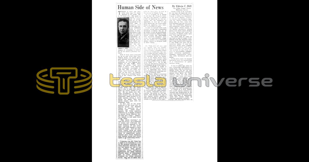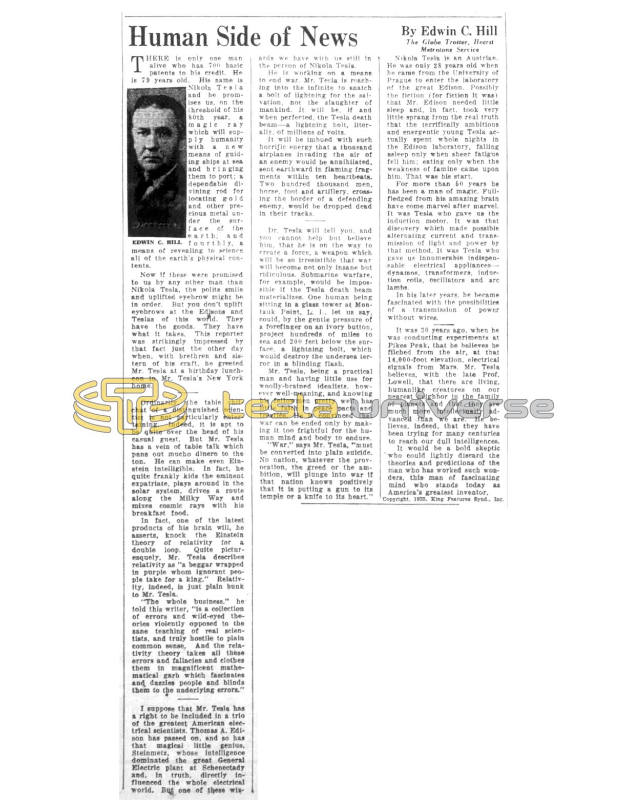 Ordinarily, the table chit-chat of a distinguished scientist is not particularly entertaining. Indeed, it is apt to be quite over the head of his casual guest. But Mr. Tesla has a vein of table talk which pans out mucho dinero to the ton. He can make even Einstein intelligible. In fact, he quite frankly kids the eminent expatriate, plays around in the solar system, drives a route along the Milky Way and mixes cosmic rays with his breakfast food.