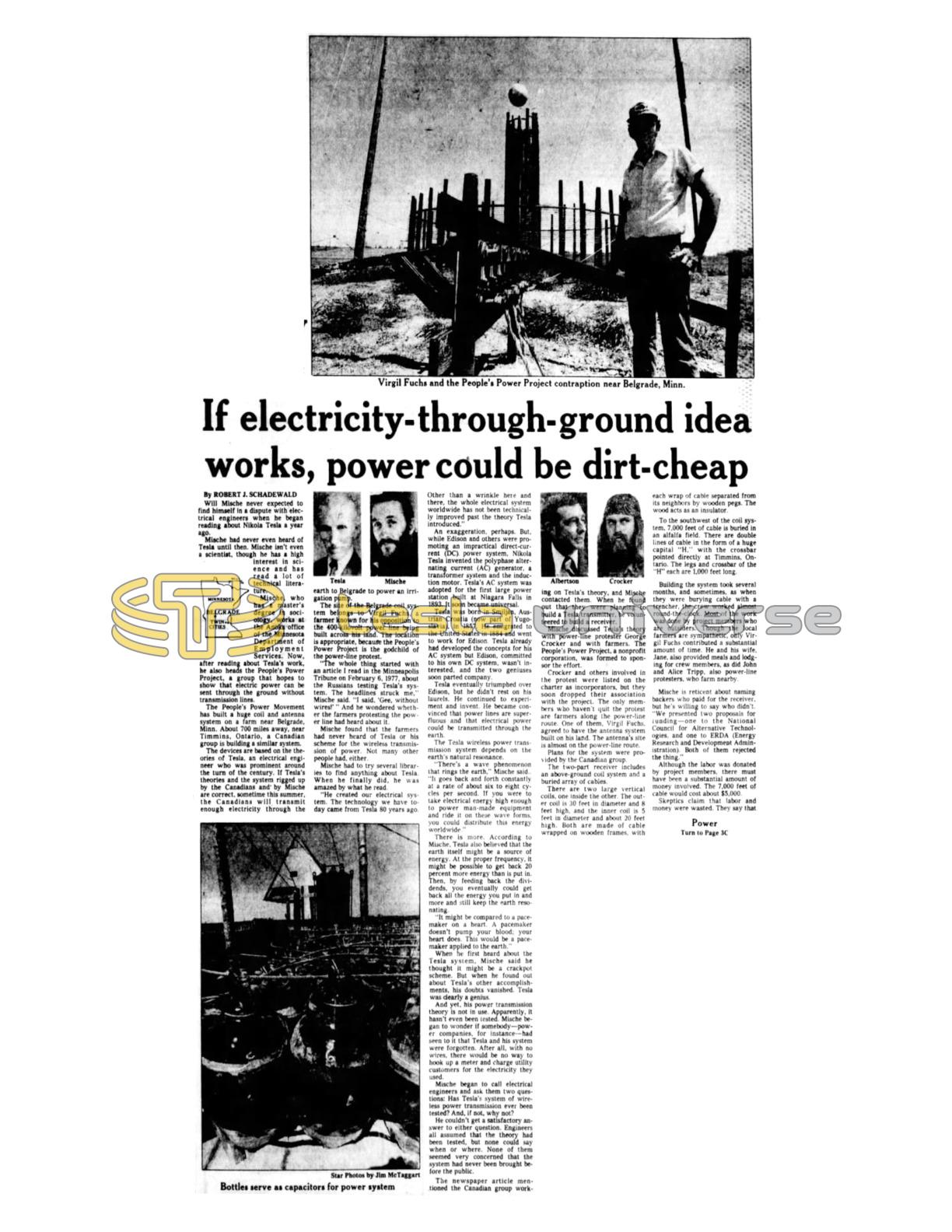 "The whole thing started with an article I read in the Minneapolis Tribune on February 6, 1977, about the Russians testing Tesla's system. The headlines struck me," Mische said. "I said, 'Gee, without wires!'" And he wondered whether the farmers protesting the power line had heard about it.