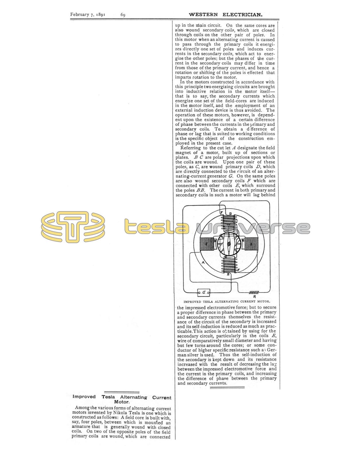 Among the various forms of alternating current motors invented by Nikola Tesla is one which is constructed as follows: A field core is built with, say, four poles, between which is mounted an armature that is generally wound with closed coils. On two of the opposite poles of the field primary coils are wound, which are connected up in the main circuit. On the same cores are also wound secondary coils, which are closed through coils on the other pair of poles. In this motor when an alternating current is caused to pass through the primary coils it energizes directly one set of poles and induces currents in the secondary coils, which act to energize the other poles; but the phases of the current in the secondary coils may differ in time from those of the primary current, and hence a rotation or shifting of the poles is effected that imparts rotation to the motor.