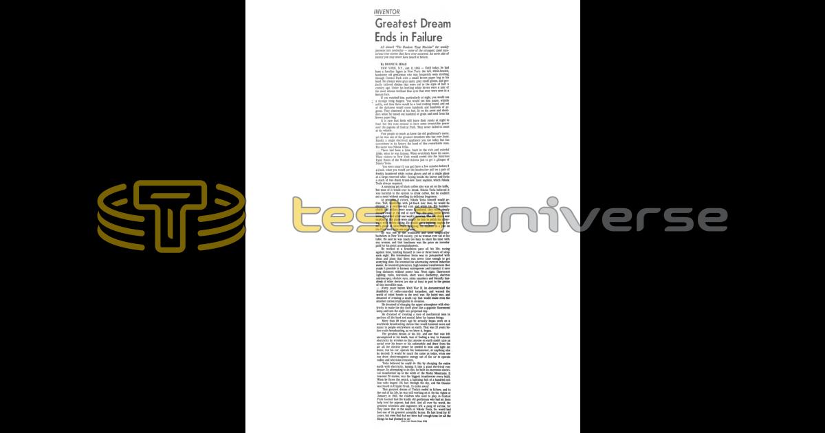 The greatest dream of his life, and one that was left uncompleted at his death, was of finding a way to transmit electricity by wireless so that anyone on earth could raise an aerial over his house or his automobile and draw from the air all the electric power he needed to heat and light his home, run his car, operate his lawnmower, or anything else he desired. It would be much the same as today, when one can draw electromagnetic energy out of the air to operate radios and television receivers.