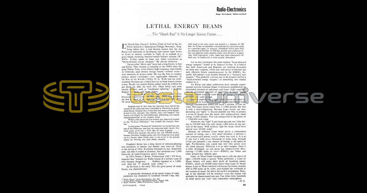 Let us now investigate the most modern "beam-directed energy weapons" hinted at by General LeMay. It is known that both Americans and Russians are working feverishly on these new weapons, which may well prove to become our only effective future countermeasure to the ICBM's. Recently, Khrushchev even brashly boasted of a "fantastic new weapon." This probably will turn out to be General LeMay's "beam-directed energy weapon," or something very closely related to it.