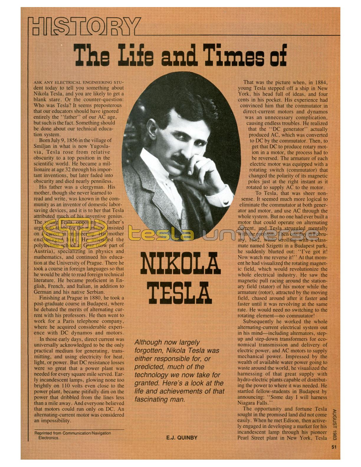 Ask any electrical engineering student today to tell you something about Nikola Tesla, and you are likely to get a blank stare. Or the counter-question: Who was Tesla? It seems preposterous that our educators should have ignored entirely the “father” of our AC age, but such is the fact. Something should be done about our technical education system.