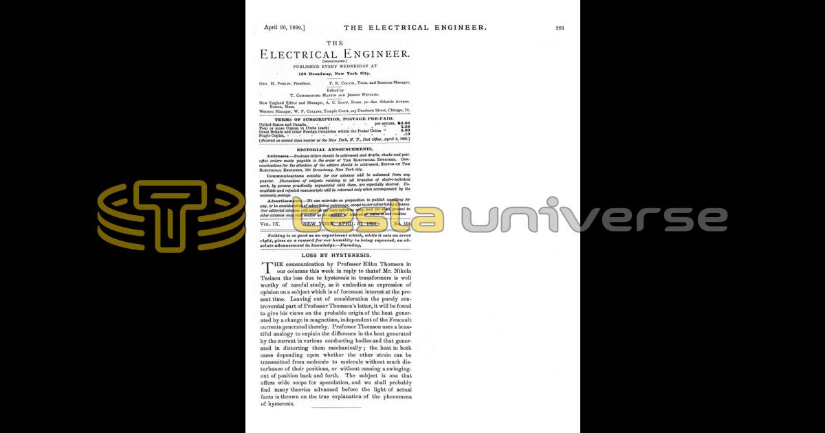 [124] - In his letter (121) appearing in your issue of April 9, page 221, Mr. N. Tesla in discussing the losses due to hysteresis in transformers takes the ground that such losses outside of the generation of electrical currents, or independent thereof, are “difficult to reconcile with our present notions on the constitution of matter generally.” Further on he says: “We cannot imagine that an appreciable amount of energy should be wasted by the elastically connected molecules swinging back and forth from their original position,” etc. While I agree with Mr. Tesla that the actual loss referred to may be due to molecular currents, yet we have no proof of such fact. Again Mr. Tesla seems to forget that loss, waste, and such terms, are more scientifically rendered, by the words “conversion into heat," and that in nature nothing is wasted or lost, but merely converted.