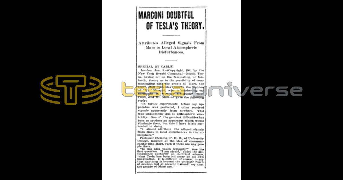 London, Jan. 5 — (Copyright. 1961, by the New York Herald Company.) — Nikola Tesla, having set up the fascinating, or fantastic, theory as to the possibility of communicating with the people of Mars, the Dally Mall yesterday sought the opinion of Mr. Marconi, who is conducting experiments in wireless telegraphy near Poole, and Mr. Marconi gave the following reply: