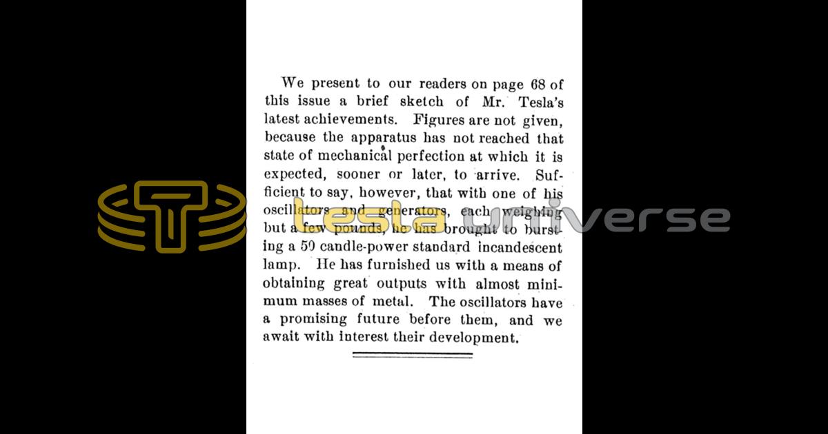 We present to our readers on page 68 of this issue a brief sketch of Mr. Tesla's latest achievements. Figures are not given, because the apparatus has not reached that state of mechanical perfection at which it is expected, sooner or later, to arrive. Sufficient to say, however, that with one of his oscillators and generators, each weighing but a few pounds, he has brought to bursting a 50 candle-power standard incandescent lamp. He has furnished us with a means of obtaining great outputs with almost minimum masses of metal. The oscillators have a promising future before them, and we await with interest their development.
