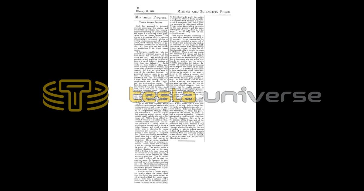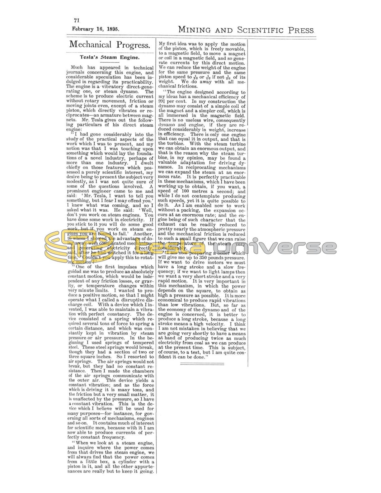 "When we look at a steam engine, and inquire where the power comes from that drives the steam engine, we will always find that the power comes from a little box, a cylinder with a piston in it, and all the other appurtenances are really but to keep it going. My first idea was to apply the motion of the piston, which is freely movable, to a magnetic field, to move a magnet or coil in a magnetic field, and so generate currents by this direct motion. We can reduce the weight of the engine for the same pressure and the same piston speed to 30 or if not of its weight. We do away with all mechanical frictions.