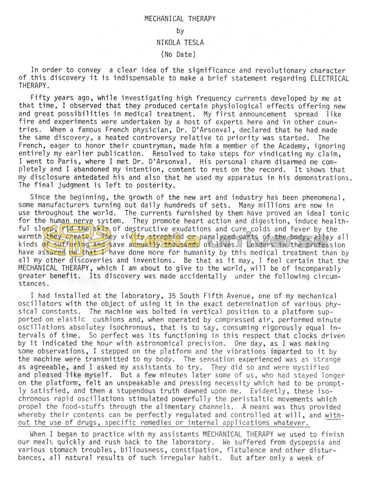 The practical application of MECHANICAL THERAPY through my oscillators will profoundly affect human life. By insuring perfect regularity of evacuations the body will function better in every respect and life will become ever so much safer and more enjoyable. One of the most important results will be the great reduction — amounting possibly to seventy-five per cent — in the number of heart failures, which are mostly caused by some acute upset of the digestive process and normal operation of the stomach. Another vital improvement will be derived from the quickened removal of toxic excretions of organs affected by disease. It is reasonable to expect that through this and other healthful actions ulcers and similar internal lesions or abscesses will be cured and relief might be obtained even in case of a cancer or other malignant growth . Skilled physicians and surgeons will be able to perform veritable miracles with such oscillations. They stimulate strongly the liver, spleen, kidneys, bladder and other organs and by these desirable actions they must contribute not a little to well being. Persons suffering from anaemia of any form will be especially helped by the treatment. But the greatest benefit will be derived from it by women who will be able to reduce without the usual tantalizing abstinence, privation, sacrifice of time and money and torture they have to endure. They will improve much in appearance, acquire clear eyes and complexions and it may be safely predicted that long continued treatment will bring forth feminine beauty never seen before. It is not to be forgotten that the elimination of countless drugs, patent medicines and specific remedies of all kinds taken internally, by which millions of people doom themselves to an early grave, will be of untold good to humanity.