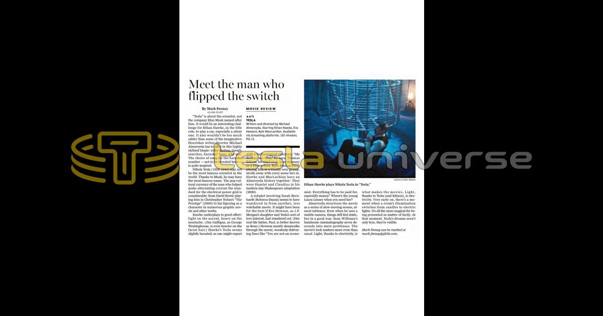 "Tesla" is about the scientist, not the company Elon Musk named after him. It would be an interesting challenge for Ethan Hawke, in the title role, to play a car, especially a silent one. It also wouldn't be too much odder than some of the imaginative flourishes writer-director Michael Almereyda has to offer in this highly stylized biopic: roller skating, Google searches, karaoke? Sure, why not. The choice of song for the karaoke number — not to be revealed here — is quite inspired.