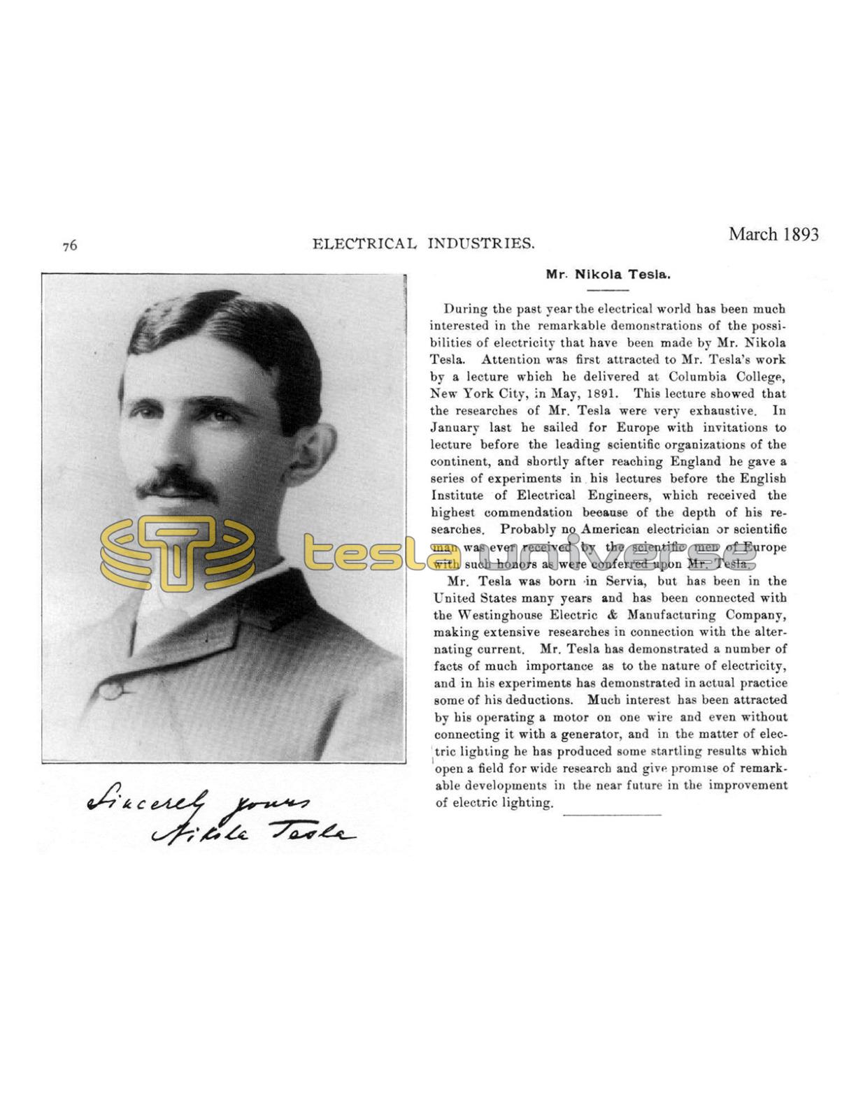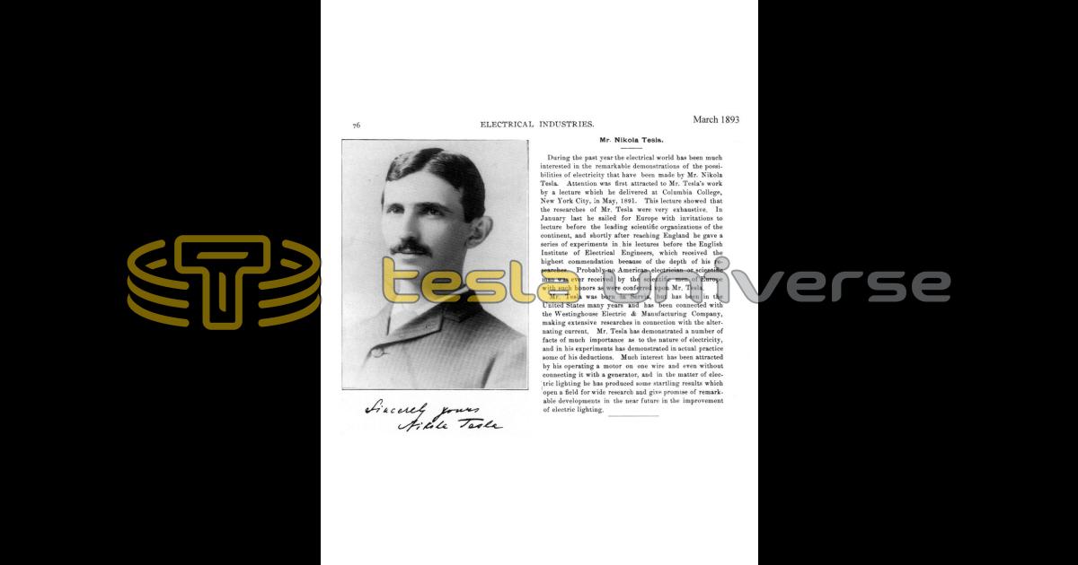 Mr. Tesla was born in Servia (sic), but has been in the United States many years and has been connected with the Westinghouse Electric & Manufacturing Company, making extensive researches in connection with the alternating current. Mr. Tesla has demonstrated a number of facts of much importance as to the nature of electricity, and in his experiments has demonstrated in actual practice some of his deductions. Much interest has been attracted by his operating a motor on one wire and even without connecting it with a generator, and in the matter of electric lighting he has produced some startling results which open a field for wide research and give promise of remarkable developments in the near future in the improvement of electric lighting.