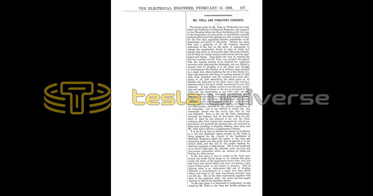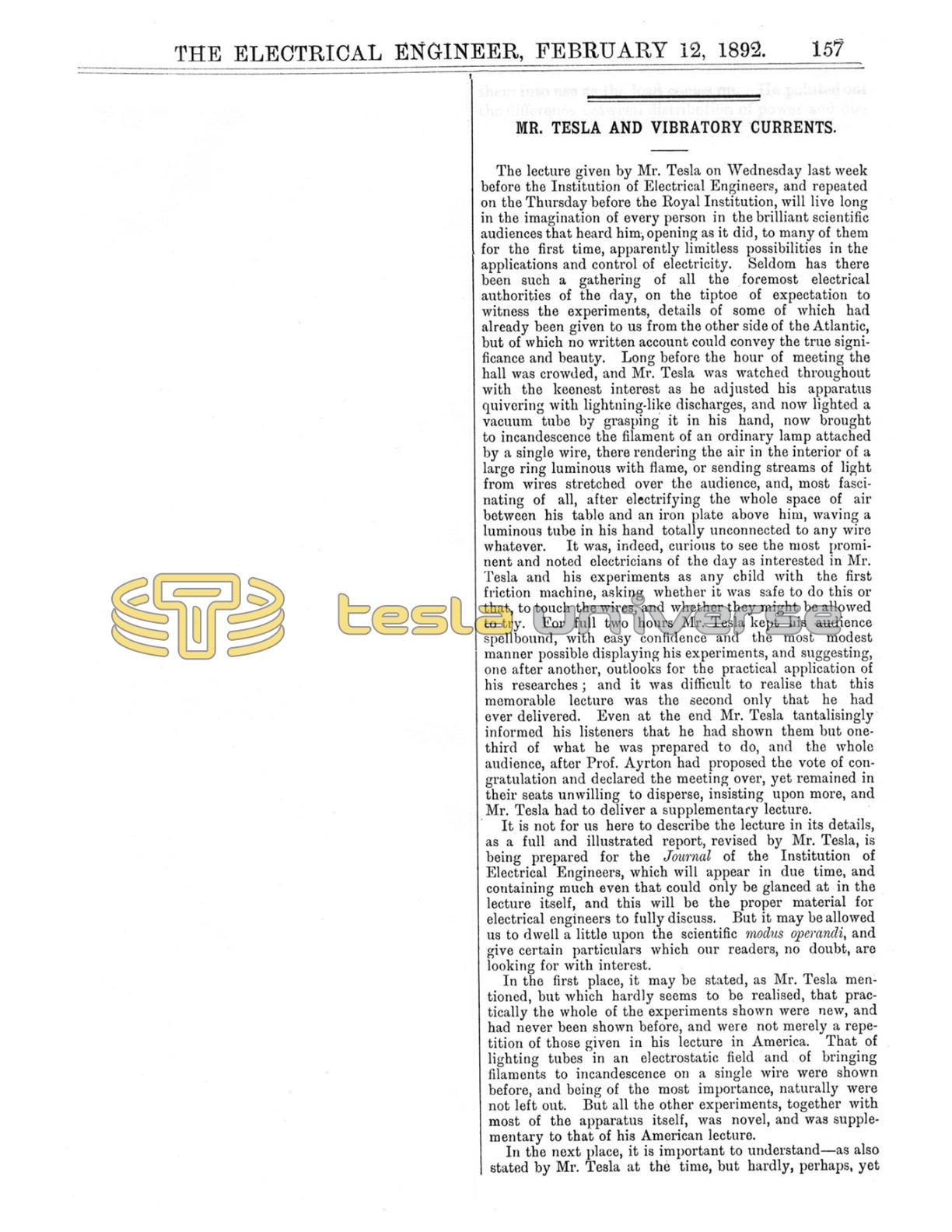 The lecture given by Mr. Tesla on Wednesday last week before the Institution of Electrical Engineers, and repeated on the Thursday before the Royal Institution, will live long in the imagination of every person in the brilliant scientific audiences that heard him, opening as it did, to many of them for the first time, apparently limitless possibilities in the applications and control of electricity. Seldom has there been such a gathering of all the foremost electrical authorities of the day, on the tiptoe of expectation to witness the experiments, details of some of which had already been given to us from the other side of the Atlantic, but of which no written account could convey the true significance and beauty. Long before the hour of meeting the hall was crowded, and Mr. Tesla was watched throughout with the keenest interest as he adjusted his apparatus quivering with lightning-like discharges, and now lighted a vacuum tube by grasping it in his hand, now brought to incandescence the filament of an ordinary lamp attached by a single wire, there rendering the air in the interior of a large ring luminous with flame, or sending streams of light from wires stretched over the audience, and, most fascinating of all, after electrifying the whole space of air between his table and an iron plate above him, waving a luminous tube in his hand totally unconnected to any wire whatever. It was, indeed, curious to see the most prominent and noted electricians of the day as interested in Mr. Tesla and his experiments as any child with the first friction machine, asking whether it was safe to do this or that, to touch the wires, and whether they might be allowed to try. For full two hours Mr. Tesla kept his audience spellbound, with easy confidence and the most modest manner possible displaying his experiments, and suggesting, one after another, outlooks for the practical application of his researches; and it was difficult to realise that this memorable lecture was the second only that he had ever delivered. Even at the end Mr. Tesla tantalisingly informed his listeners that he had shown them but one-third of what he was prepared to do, and the whole audience, after Prof. Ayrton had proposed the vote of congratulation and declared the meeting over, yet remained in their seats unwilling to disperse, insisting upon more, and Mr. Tesla had to deliver a supplementary lecture.