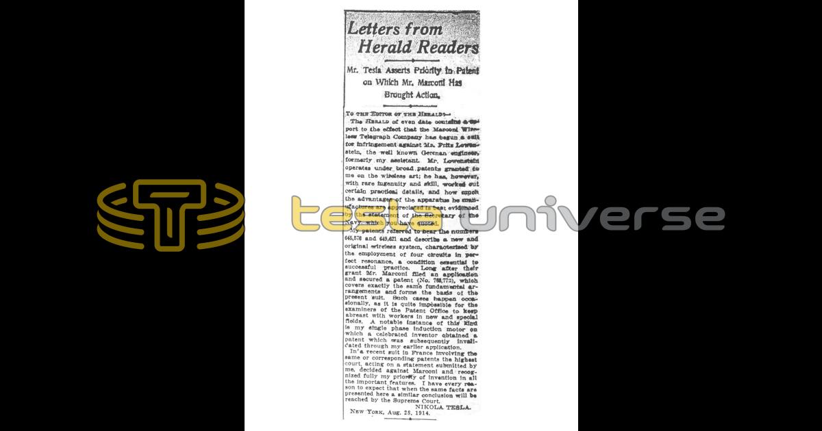 The Herald of even date contains a report to the effect that the Marconi Wireless Telegraph Company has begun a suit for infringement against Mr. Fritz Lowenstein, the well known German engineer, formerly my assistant. Mr. Lowenstein operates under broad patents granted to me on the wireless art; he has, however, with rare ingenuity and skill, worked out certain practical details, and how much the advantages of the apparatus he manufactures are appreciated is best evidenced by the statement of the Secretary of the Navy, which you have quoted.