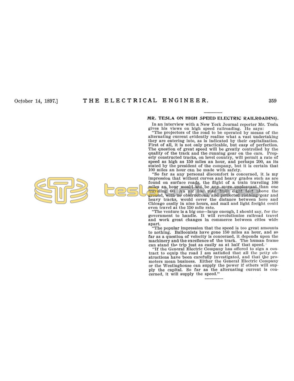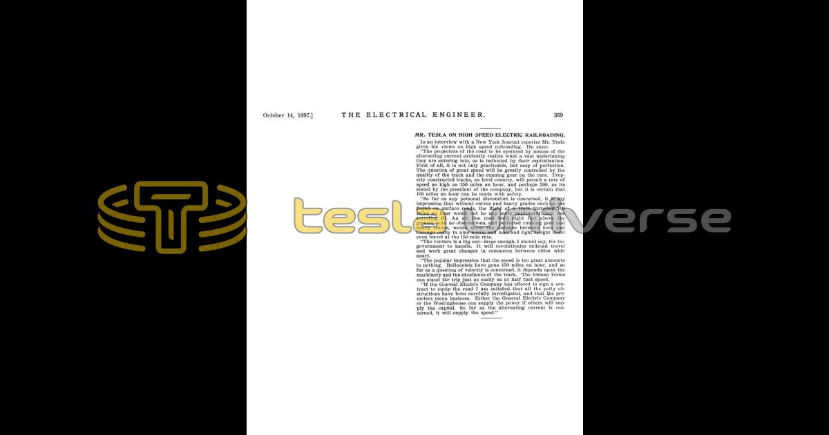 In an interview with a New York Journal reporter Mr. Tesla gives his views on high speed railroading. He says: