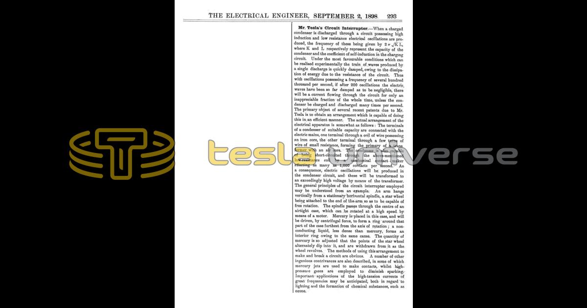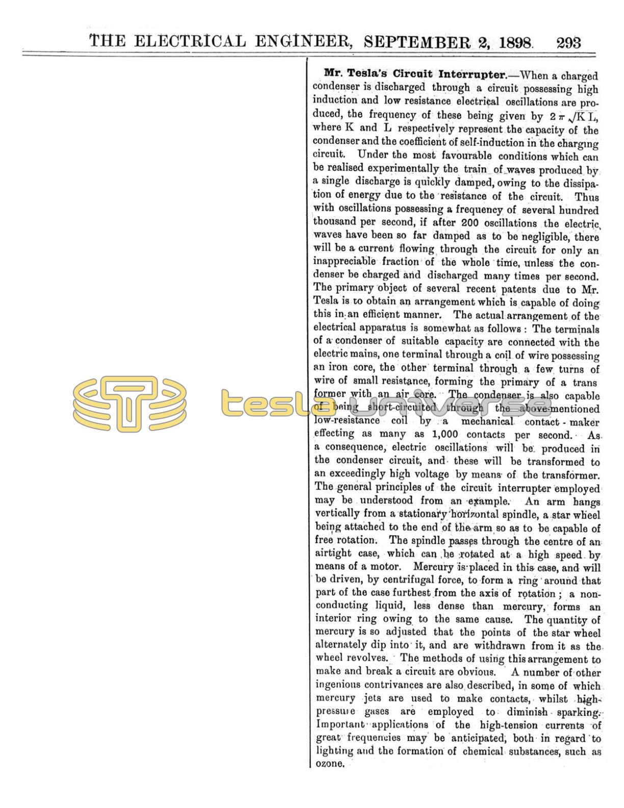 When a charged condenser is discharged through a circuit possessing high induction and low resistance electrical oscillations are produced, the frequency of these being given by 2π √KL, where K and L respectively represent the capacity of the condenser and the coefficient of self-induction in the charging circuit. Under the most favourable conditions which can be realised experimentally the train of waves produced by a single discharge is quickly damped, owing to the dissipation of energy due to the resistance of the circuit. Thus with oscillations possessing a frequency of several hundred thousand per second, if after 200 oscillations the electric waves have been so far damped as to be negligible, there will be a current flowing through the circuit for only an inappreciable fraction of the whole time, unless the condenser be charged and discharged many times per second. The primary object of several recent patents due to Mr. Tesla is to obtain an arrangement which is capable of doing this in an efficient manner. The actual arrangement of the electrical apparatus is somewhat as follows: The terminals of a condenser of suitable capacity are connected with the electric mains, one terminal through a coil of wire possessing an iron core, the other terminal through a few turns of wire of small resistance, forming the primary of a transformer with an air core. The condenser is also capable of being short-circuited through the above-mentioned low-resistance coil by a mechanical contact - maker effecting as many as 1,000 contacts per second. As. a consequence, electric oscillations will be produced in the condenser circuit, and these will be transformed to an exceedingly high voltage by means of the transformer. The general principles of the circuit interrupter employed may be understood from an example. An arm hangs vertically from a stationary horizontal spindle, a star wheel being attached to the end of the arm so as to be capable of free rotation. The spindle passes through the centre of an airtight case, which can be rotated at a high speed by means of a motor. Mercury is placed in this case, and will be driven, by centrifugal force, to form a ring around that part of the case furthest from the axis of rotation; a nonconducting liquid, less dense than mercury, forms an interior ring owing to the same cause. The quantity of mercury is so adjusted that the points of the star wheel alternately dip into it, and are withdrawn from it as the wheel revolves. The methods of using this arrangement to make and break a circuit are obvious. A number of other ingenious contrivances are also described, in some of which mercury jets are used to make contacts, whilst high-pressure gases are employed to diminish sparking. Important applications of the high-tension currents of great frequencies may be anticipated, both in regard to lighting and the formation of chemical substances, such as ozone.