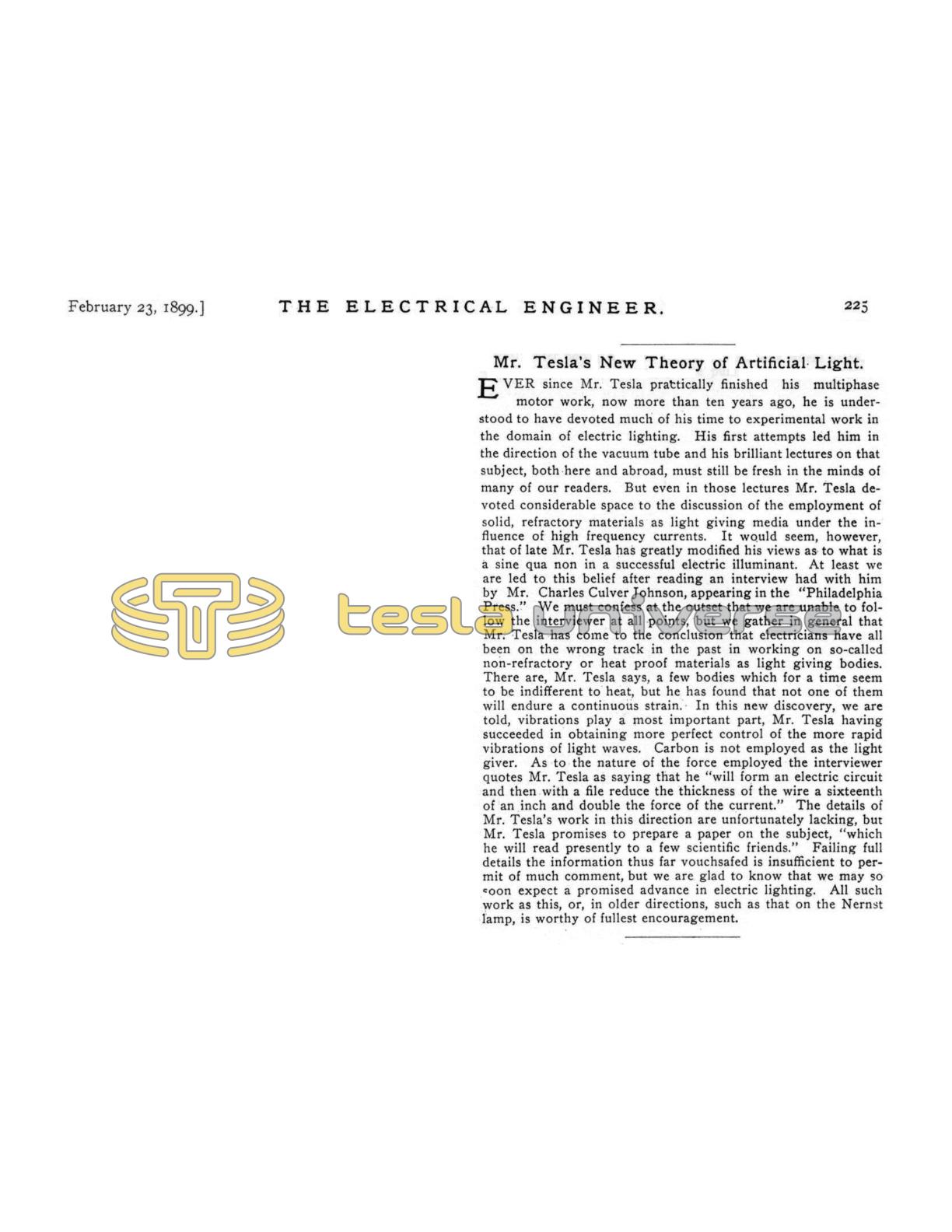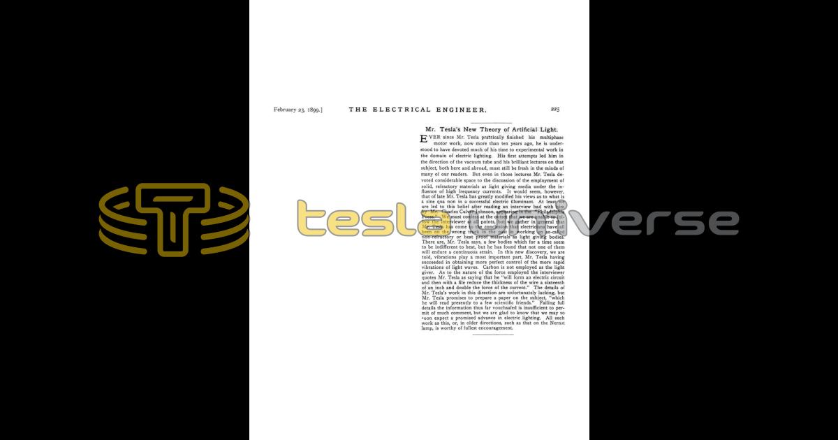 Mr. Tesla's New Theory of Artificial Light