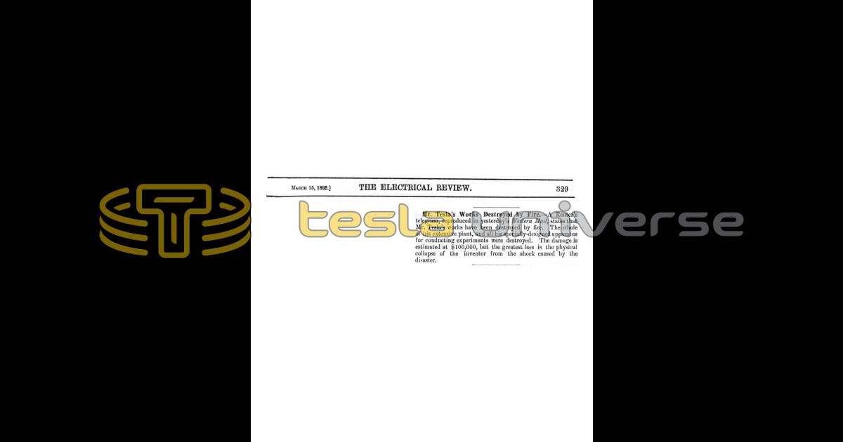 A Reuter's telegram, reproduced in yesterday's Western Mail, states that Mr. Tesla's works have been destroyed by fire. The whole of his extensive plant, and all his specially-designed apparatus for conducting experiments were destroyed. The damage is estimated at $100,000, but the greatest loss is the physical collapse of the inventor from the shock caused by the disaster.