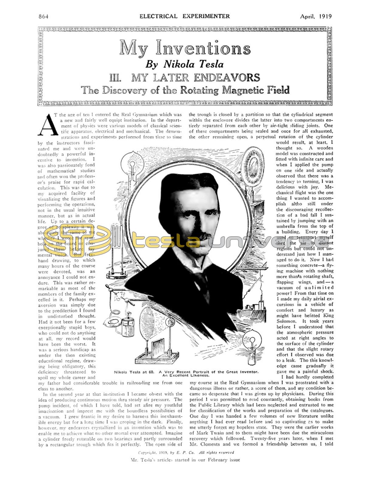 In 1899, when I was past forty and carrying on my experiments in Colorado, I could hear very distinctly thunderclaps at a distance of 550 miles. The limit of audition for my young assistants was scarcely more than 150 miles. My ear was thus over thirteen times more sensitive. Yet at that time I was, so to speak, stone deaf in comparison with the acuteness of my hearing while under the nervous strain. In Budapest I could hear the ticking of a watch with three rooms between me and the time-piece. A fly alighting on a table in the room would cause a dull thud in my ear. A carriage passing at a distance of a few miles fairly shook my whole body. The whistle of a locomotive twenty or thirty miles away made the bench or chair on which I sat vibrate so strongly that the pain was unbearable. The ground under my feet trembled continuously. I had to support my bed on rubber cushions to get any rest at all. The roaring noises from near and far often produced the effect of spoken words which would have frightened me had I not been able to resolve them into their accidental components. The sun’s rays, when periodically intercepted, would cause blows of such force on my brain that they would stun me. I had to summon all my will power to pass under a bridge or other structure as I experienced a crushing pressure on the skull. In the dark I had the sense of a bat and could detect the presence of an object at a distance of twelve feet by a peculiar creepy sensation on the forehead. My pulse varied from a few to two hundred and sixty beats and all the tissues of the body quivered with twitchings and tremors which was perhaps the hardest to bear. A renowned physician who gave me daily large doses of Bromide of Potassium pronounced my malady unique and incurable. It is my eternal regret that I was not under the observation of experts in physiology and psychology at that time. I clung desperately to life, but never expected to recover. Can anyone believe that so hopeless a physical wreck could ever be transformed into a man of astonishing strength and tenacity, able to work thirty-eight years almost without a day’s interruption, and find himself still strong and fresh in body and mind? Such is my case. A powerful desire to live and to continue the work, and the assistance of a devoted friend and athlete accomplished the wonder. My health returned and with it the vigor of mind. In attacking the problem again I almost regretted that the struggle was soon to end. I had so much energy to spare. When I undertook the task it was not with a resolve such as men often make. With me it was a sacred vow, a question of life and death. I knew that I would perish if I failed. Now I felt that the battle was won. Back in the deep recesses of the brain was the solution, but I could not yet give it outward expression. One afternoon, which is ever present in my recollection, I was enjoying a walk with my friend in the City Park and reciting poetry. At that age I knew entire books by heart, word for word. One of these was Göethe’s “Faust.” The sun was just setting and reminded me of the glorious passage: