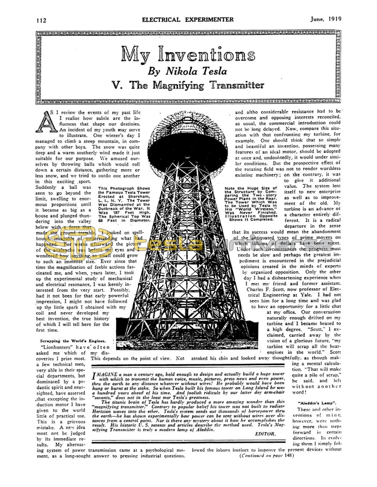 Imagine a man a century ago, bold enough to design and actually build a huge tower with which to transmit the human voice, music, pictures, press news and even power, thru the earth to any distance whatever without wires! He probably would have been hung or burnt at the stake. So when Tesla built his famous tower on Long Island he was a hundred years ahead of his time. And foolish ridicule by our latter day arm-chair “savants,” does not in the least mar Tesla’s greatness.