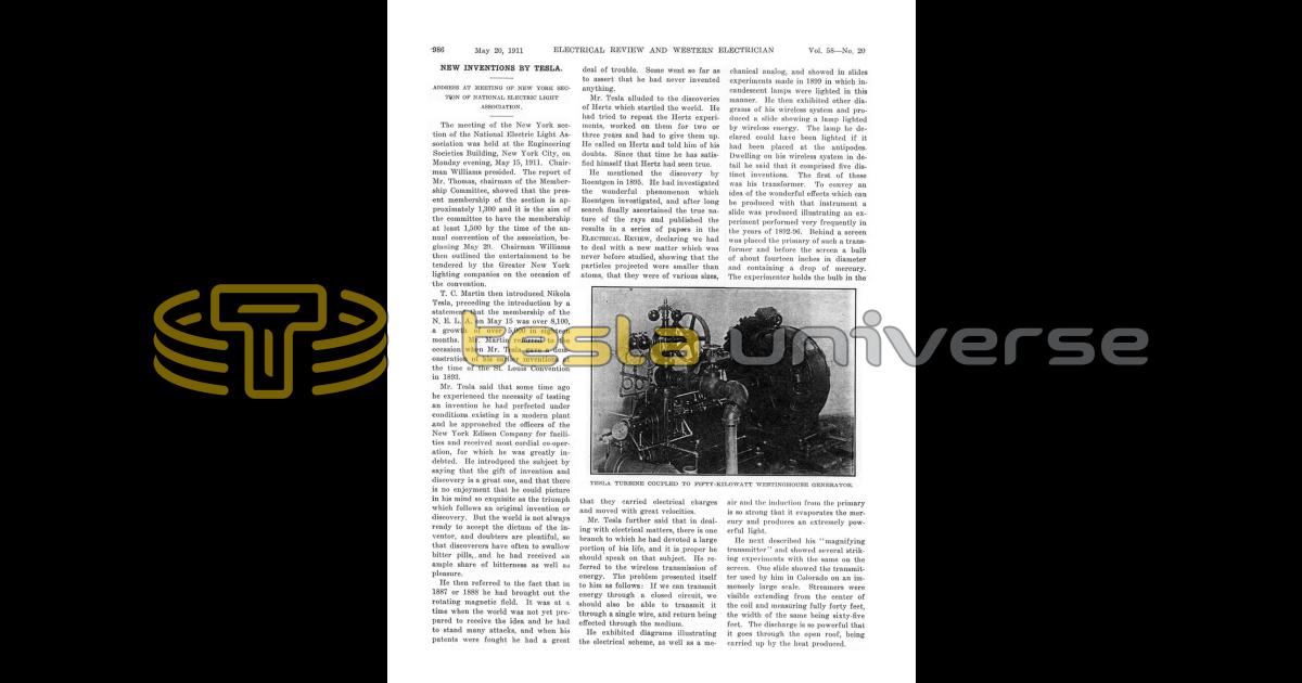 Nikola Tesla Articles Newspaper and magazine articles related to Nikola Tesla New Inventions By Tesla Electrical Review and Western Electrician May 20th, 1911 Page number(s): 986-988 This article contains the Nikola Tesla lecture, "New Inventions By Tesla" and is intentionally not duplicated here. Downloads Downloads for this article are available to members.Log in or join today to access all content. Downloads Downloads for this article are available to members.Log in or join today to access all content. Pagination Enjoy other articles First First item Previous Previous item Next Next item Last Last item Within the Universe Timeline Important moments and events related to Tesla. Articles Nikola Tesla in the press. Books Books written by and about Nikola Tesla. Documents Nikola Tesla documents, files and papers. Quotes Profound and insightful quotes by Nikola Tesla. Movies and TV Nikola Tesla on the screen. Patents Nikola Tesla held around 200 patents worldwide. Landmarks Locations related to Nikola Tesla. Images Nikola Tesla image and photo library. Show more Pagination Enjoy other articles First First item Previous Previous item Next Next item Last Last item Within the Universe Documents Nikola Tesla documents, files and papers. Quotes Profound and insightful quotes by Nikola Tesla. Books Books written by and about Nikola Tesla. Timeline Important moments and events related to Tesla. Patents Nikola Tesla held around 200 patents worldwide. Images Nikola Tesla image and photo library. Landmarks Locations related to Nikola Tesla. Letters Letters to, from and about Nikola Tesla. Movies and TV Nikola Tesla on the screen.