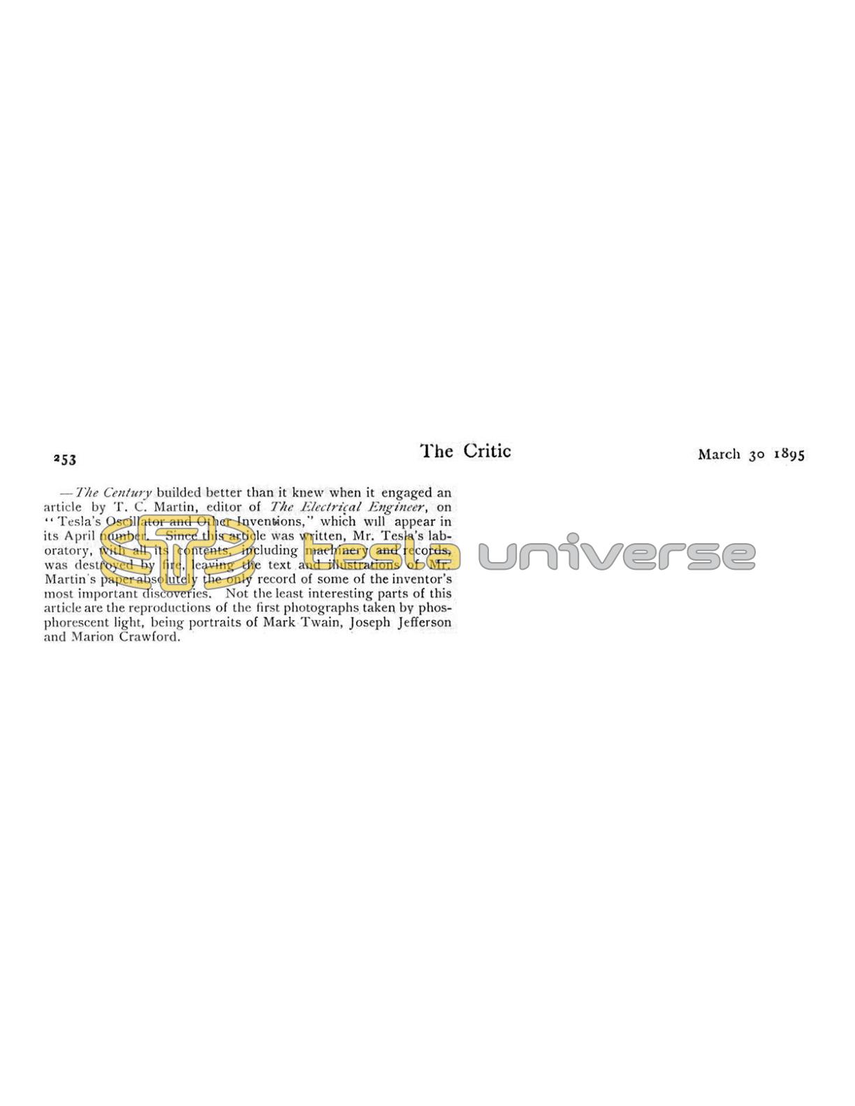 —The Century builded better than it knew when it engaged an article by T. C. Martin, editor of The Electrical Engineer, on "Tesla's Oscillator and Other Inventions," which will appear in its April number. Since this article was written, Mr. Tesla's laboratory, with all its contents, including machinery and records, was destroyed by fire, leaving the text and illustrations of Mr. Martin's paper absolutely the only record of some of the inventor's most important discoveries. Not the least interesting parts of this article are the reproductions of the first photographs taken by phosphorescent light, being portraits of Mark Twain, Joseph Jefferson and Marion Crawford.