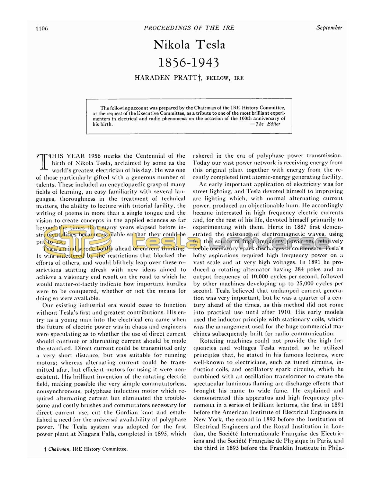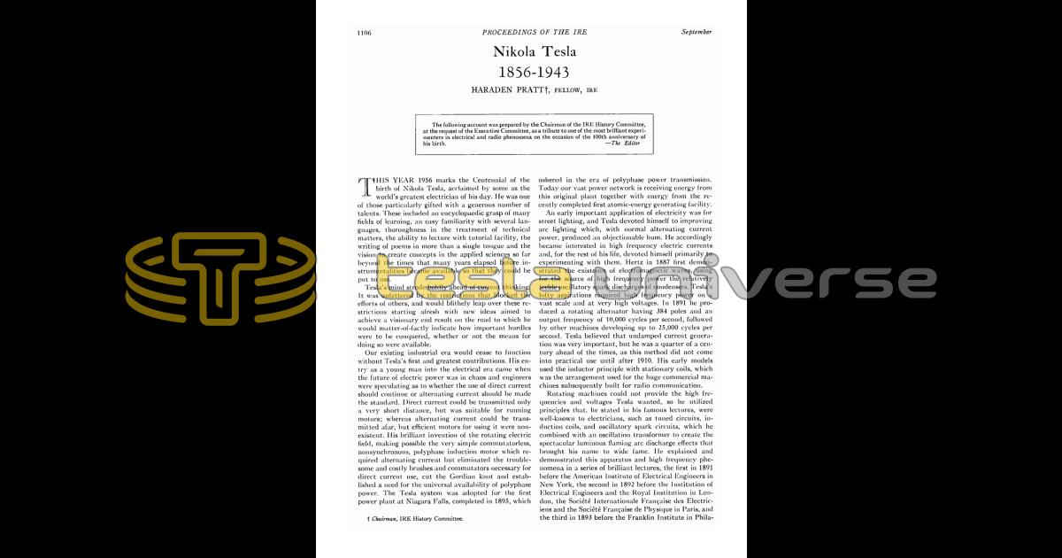 This year 1956 marks the Centennial of the birth of Nikola Tesla, acclaimed by some as the world's greatest electrician of his day. He was one of those particularly gifted with a generous number of talents. These included an encyclopaedic grasp of many fields of learning, an easy familiarity with several languages, thoroughness in the treatment of technical matters, the ability to lecture with tutorial facility, the writing of poems in more than a single tongue and the vision to create concepts in the applied sciences so far beyond the times that many years elapsed before instrumentalities became available so that they could be put to use.