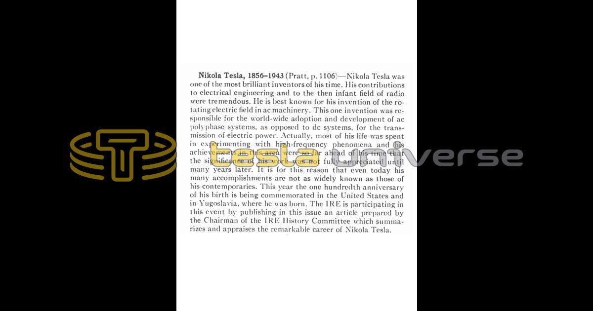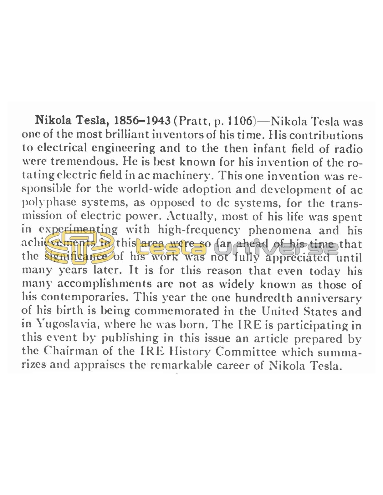 (Pratt, p. 1106) — Nikola Tesla was one of the most brilliant inventors of his time. His contributions to electrical engineering and to the then infant field of radio were tremendous. He is best known for his invention of the rotating electric field in ac machinery. This one invention was responsible for the worldwide adoption and development of ac polyphase systems, as opposed to dc systems, for the transmission of electric power. Actually, most of his life was spent in experimenting with high-frequency phenomena and his achievements in this area were so far ahead of his time that the significance of his work was not fully appreciated until many years later. It is for this reason that even today his many accomplishments are not as widely known as those of his contemporaries. This year the one hundredth anniversary of his birth is being commemorated in the United States and in Yugoslavia, where he was born. The IRE is participating in this event by publishing in this issue an article prepared by the Chairman of the IRE History Committee which summarizes and appraises the remarkable career of Nikola Tesla.
