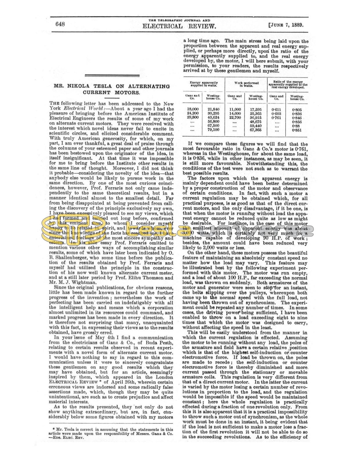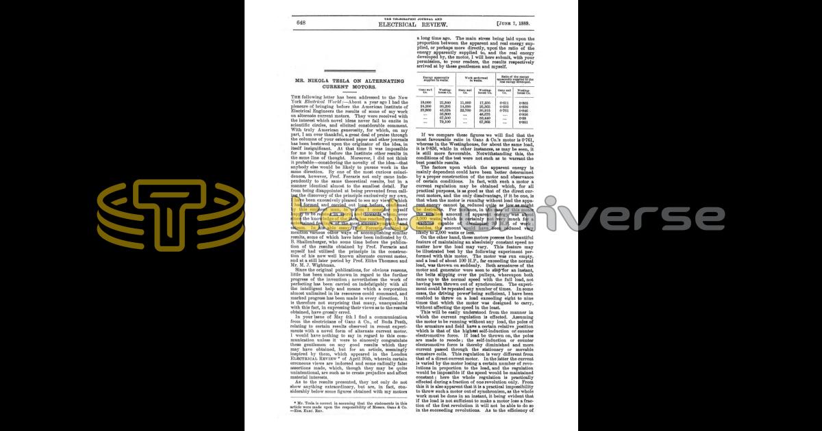 The following letter has been addressed to the New York Electrical World: - About a year ago I had the pleasure of bringing before the American Institute of Electrical Engineers the results of some of my work on alternate current motors. They were received with the interest which novel ideas never fail to excite in scientific circles, and elicited considerable comment. With truly American generosity, for which, on my part, I am ever thankful, a great deal of praise through the columns of your esteemed paper and other journals has been bestowed upon the originator of the idea, in itself insignificant. At that time it was impossible for me to bring before the Institute other results in the same line of thought. Moreover, I did not think it probable - considering the novelty of the idea - that anybody else would be likely to pursue work in the same direction. By one of the most curious coincidences, however, Prof. Ferraris not only came independently to the same theoretical results, but in a manner identical almost to the smallest detail. Far from being disappointed at being prevented from calling the discovery of the principle exclusively my own, I have been excessively pleased to see my views, which I had formed and carried out long before, confirmed by this eminent man, to whom I consider myself happy to be related in spirit, and towards whom, ever since the knowledge of the facts has reached me, I have entertained feelings of the most sincere sympathy and esteem. In his able essay Prof. Ferraris omitted to mention various other ways of accomplishing similar results, some of which have later been indicated by O. B. Shallenberger, who some time before the publication of the results obtained by Prof. Ferraris and myself had utilised the principle in the construction of his now well known alternate current meter, and at a still later period by Prof. Elihu Thomson and Mr. M. J. Wightman.