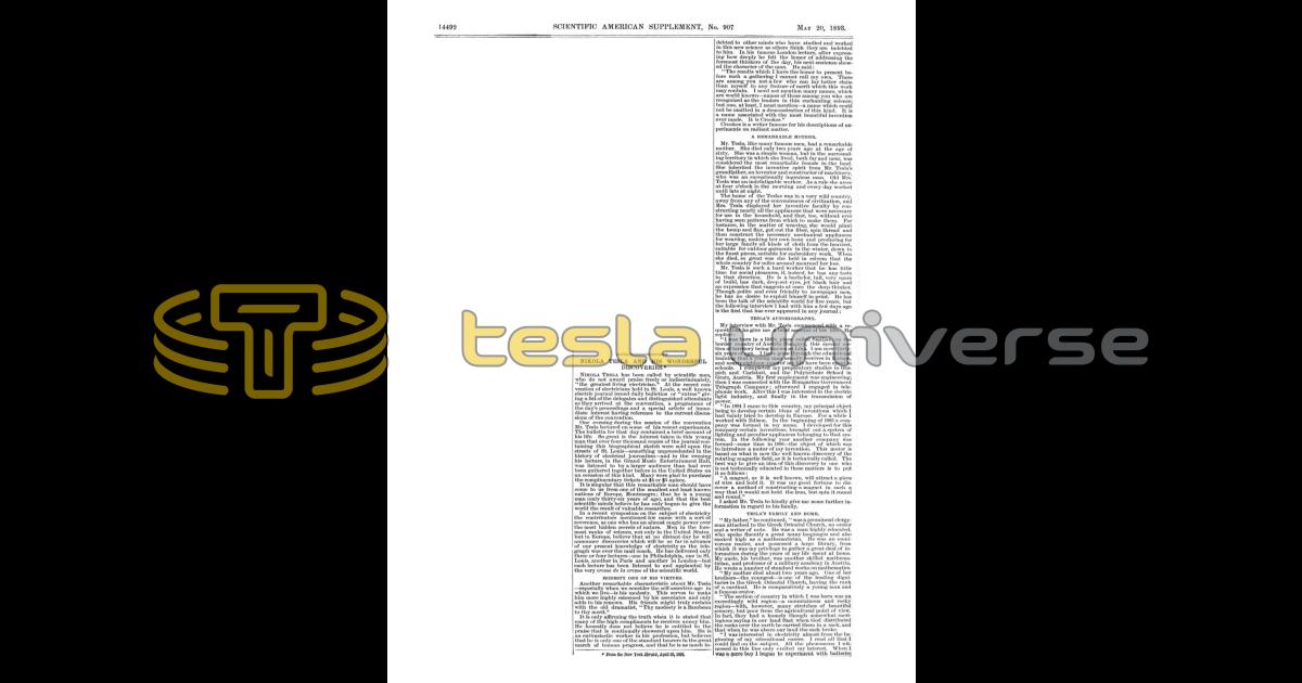 Nikola Tesla Articles Newspaper and magazine articles related to Nikola Tesla Nikola Tesla and His Wonderful Discoveries (reprint 2) Scientific American Supplement May 20th, 1893 Note: This is a reprint of a New York Herald article from April 23rd, 1893 and is intentionally not duplicated here. Downloads Downloads for this article are available to members.Log in or join today to access all content. Downloads Downloads for this article are available to members.Log in or join today to access all content. Pagination Enjoy other articles First First item Previous Previous item Next Next item Last Last item Within the Universe Timeline Important moments and events related to Tesla. Articles Nikola Tesla in the press. Books Books written by and about Nikola Tesla. Documents Nikola Tesla documents, files and papers. Quotes Profound and insightful quotes by Nikola Tesla. Movies and TV Nikola Tesla on the screen. Patents Nikola Tesla held around 200 patents worldwide. Landmarks Locations related to Nikola Tesla. Images Nikola Tesla image and photo library. Show more Pagination Enjoy other articles First First item Previous Previous item Next Next item Last Last item Within the Universe Documents Nikola Tesla documents, files and papers. Quotes Profound and insightful quotes by Nikola Tesla. Books Books written by and about Nikola Tesla. Timeline Important moments and events related to Tesla. Patents Nikola Tesla held around 200 patents worldwide. Images Nikola Tesla image and photo library. Landmarks Locations related to Nikola Tesla. Letters Letters to, from and about Nikola Tesla. Movies and TV Nikola Tesla on the screen.