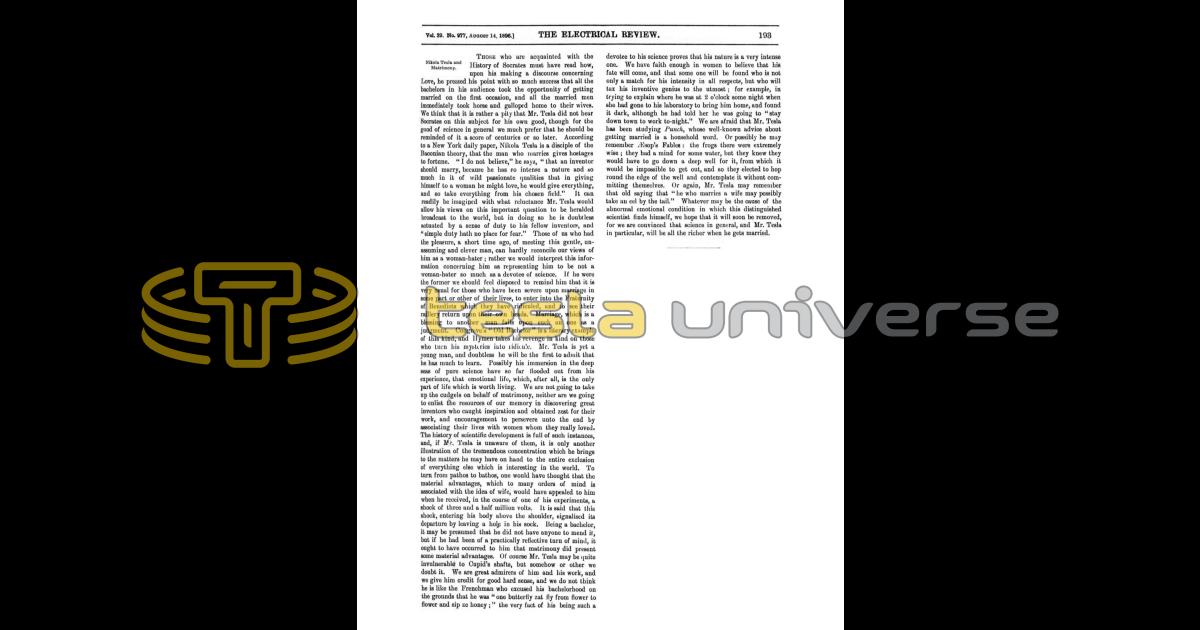 Those who are acquainted with the History of Socrates must have read how, upon his making a discourse concerning Love, he pressed his point with so much success that all the bachelors in his audience took the opportunity of getting married on the first occasion, and all the married men immediately took horse and galloped home to their wives. We think that it is rather a pity that Mr. Tesla did not hear Socrates on this subject for his own good, though for the good of science in general we much prefer that he should be reminded of it a score of centuries or so later. According to a New York daily paper, Nikola Tesla is a disciple of the Baconian theory, that the man who marries gives hostages to fortune. "I do not believe," he says, "that an inventor should marry, because he has to intense a nature and so much in it of wild passionate qualities that in giving himself to a woman he might love, he would give everything, and so take everything from his chosen field." It can readily be imagined with what reluctance Mr. Tesla would allow his views on this important question to be heralded broadcast to the world, but in doing so he is doubtless actuated by a sense of duty to his fellow inventore, and "simple duty hath no place for fear." Those of us who had the pleasure, a short time ago, of meeting this gentle, unassuming and clever man, can hardly reconcile our views of him as a woman-hater; rather we would interpret this information concerning him as representing him to be not a woman-hater so much as a devotee of science. If he were the former we should feel disposed to remind him that it is very usual for those who have been severe upon marriage in some part or other of their lives, to enter into the Fraternity of Benedicts which they have ridiculed, and to see their raillery return upon their own heads. Marriage, which is a blessing to another man falls upon such an one as a judgment. Congreve's "Old Bachelor" is a literary example of this kind, and Hymen takes his revenge in kind on those who turn his mysteries into ridicule. Mr. Tesla is yet a young man, and doubtless he will be the first to admit that he has much to learn. Possibly his immersion in the deep seas of pure science have so far flooded out from his experience, that emotional life, which, after all, is the only part of life which is worth living. We are not going to take up the cudgels on behalf of matrimony, neither are we going to enlist the resources of our memory in discovering great inventors who caught inspiration and obtained zest for their work, and encouragement to persevere unto the end by associating their lives with women whom they really loved. The history of scientific development is full of such instances, and, if Mr. Tesla is unaware of them, it is only another illustration of the tremendous concentration which he brings to the matters he may have on hand to the entire exclusion of everything else which is interesting in the world. To turn from pathos to bathos, one would have thought that the material advantages, which to many orders of mind is associated with the idea of wife, would have appealed to him when he received, in the course of one of his experiments, a shock of three and a half million volts. It is said that this shock, entering his body above the shoulder, signalised its departure by leaving a hole in his sock. Being a bachelor, it may be presumed that he did not have anyone to mend it, but if he had been of a practically reflective turn of mind, it ought to have occurred to him that matrimony did present some material advantages. Of course Mr. Tesla may be quite invulnerable to Cupid's shafts, but somehow or other we doubt it. We are great admirers of him and his work, and we give him credit for good hard sense, and we do not think he is like the Frenchman who excused his bachelorhood on the grounds that he was "one butterfly zat fly from flower to flower and sip ze honey;" the very fact of his being such a devotee to his science proves that his nature is a very intense one. We have faith enough in women to believe that his fate will come, and that some one will be found who is not only a match for his intensity in all respects, but who will tax his inventive genius to the utmost; for example, in trying to explain where he was at 2 o'clock some night when she had gone to his laboratory to bring him home, and found it dark, although he had told her he was going to "stay down town to work to-night." We are afraid that Mr. Tesla has been studying Punch, whose well-known advice about getting married is a household word. Or possibly he may remember Esop's Fables: the frogs there were extremely wise; they had a mind for some water, but they knew they would have to go down a deep well for it, from which it would be impossible to get out, and so they elected to hop round the edge of the well and contemplate it without committing themselves. Or again, Mr. Tesla may remember that old saying that "he who marries a wife may possibly take an eel by the tail." Whatever may be the cause of the abnormal emotional condition in which this distinguished scientist finds himself, we hope that it will soon be removed, for we are convinced that science in general, and Mr. Tesla in particular, will be all the richer when he gets married.