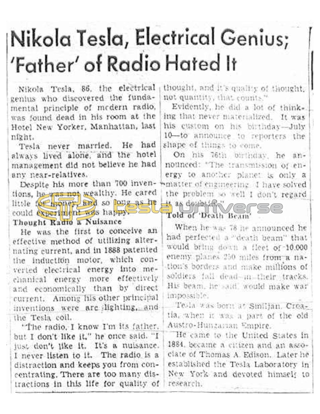 Nikola Tesla, 86, the electrical genius who discovered the fundamental principle of modern radio, was found dead in his room at the Hotel New Yorker, Manhattan, last night.