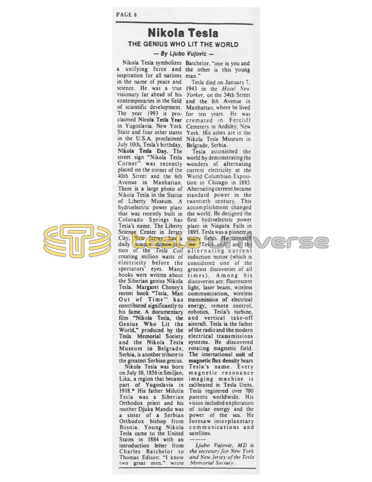 Ljubo Vujovic, MD is the secretary for New York and New Jersey of the Tesla Memorial Society.