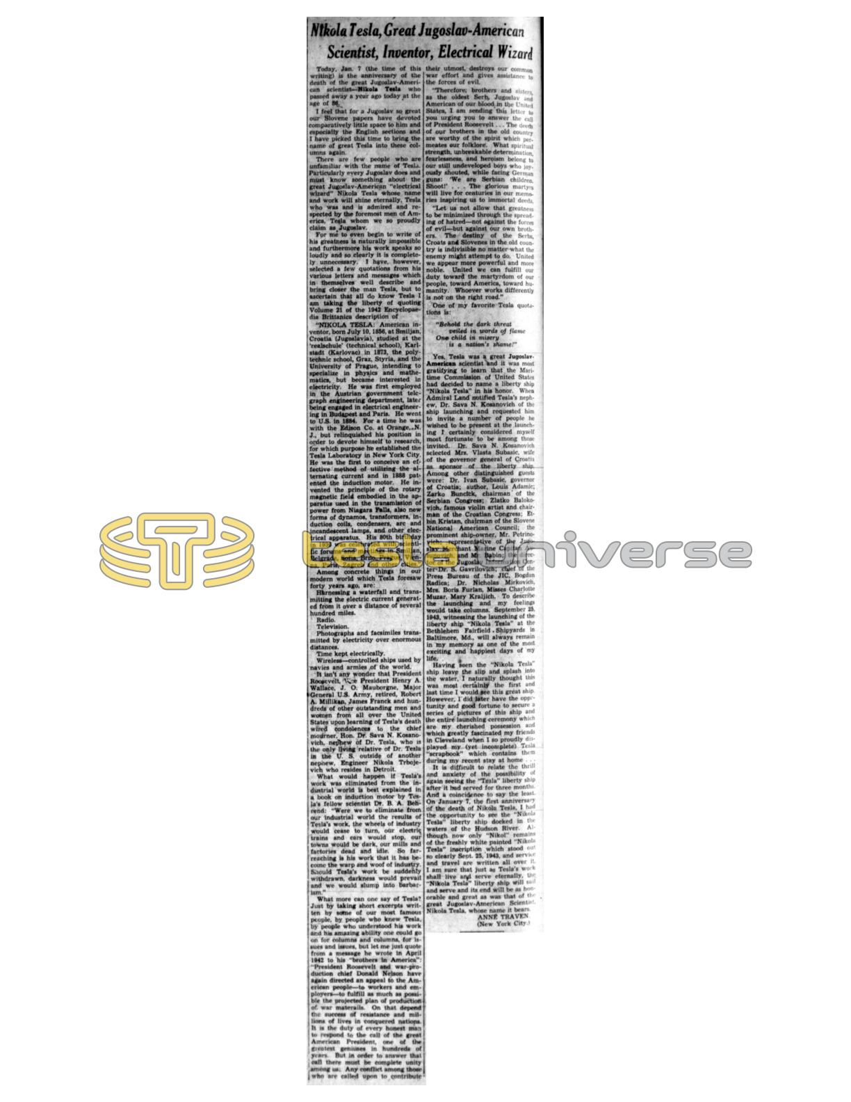 Yes, Tesla was a great Jugoslav-American scientist and it was most gratifying to learn that the Maritime Commission of United States had decided to name a liberty ship "Nikola Tesla" in his honor. When Admiral Land notified Tesla's nephew, Dr. Sava N. Kosanovich of the ship launching and requested him to invite a number of people he I wished to be present at the launching I certainly considered myself most fortunate to be among those invited. Dr. Sava N. Kosanovich selected Mrs. Vlasta Subasic, wife of the governor general of Croatia as sponsor of the liberty ship. Among other distinguished guests were: Dr. Ivan Subasic, governor of Croatia; author, Louis Adamie; Zarko Bunctek, chairman of the Serbian Congress; Zlatko Balokovich, famous violin artist and chairman of the Croatian Congress; Etbin Kristan, chairman of the Slovene National American Council; the prominent ship-owner, Mr. Petrinovich: representative of the Jugoslav Merchant Marine Capitan Autunovich, and Mr. Babin; the director of the Jugoslav Information Center Dr. S. Gavrilovich; chief of the Press Bureau of the JIC, Bogdan Radica; Dr. Nicholas Mirkovich, Mrs. Boris Furlan, Misses Charlotte Muzar, Mary Kraljich. To describe the launching and my feelings would take columns. September 25, 1943, witnessing the launching of the liberty ship "Nikola Tesla" at the Bethlehem Fairfield. Shipyards in Baltimore, Md., will always remain in my memory as one of the most exciting and happiest days of my life.