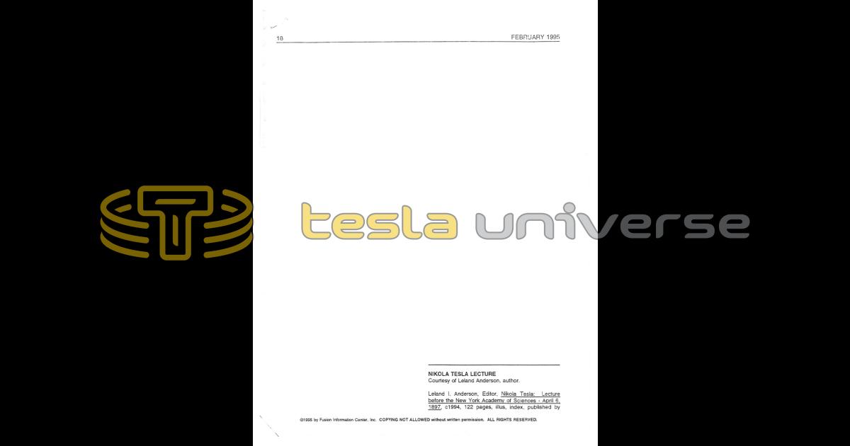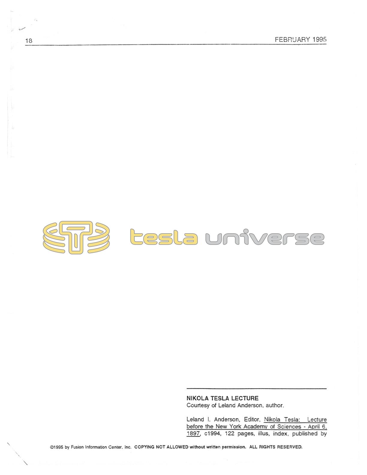 Leland I. Anderson, Editor, Nikola Tesla: Lecture before the New York Academy of Sciences - April 6, 1897, c1994, 122 pages, illus, index, published by Twenty First Century Books, Breckenridge, Colorado, paperback, $12.95.