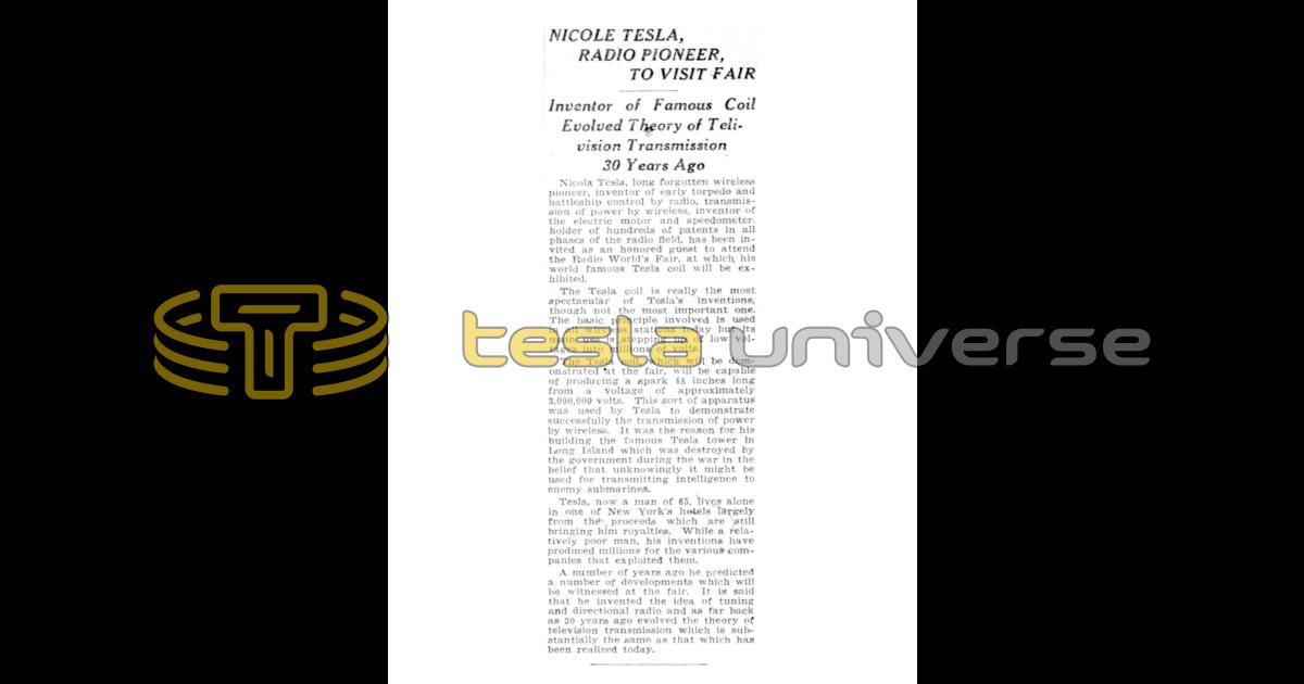 Nikola Tesla, long forgotten wireless pioneer, inventor of early torpedo and battleship control by radio, transmission of power by wireless, inventor of the electric motor and speedometer, holder of hundreds of patents in all phases of the radio field, has been invited as an honored guest to attend the Radio World's Fair, at which his world famous Tesla coil will be exhibited.