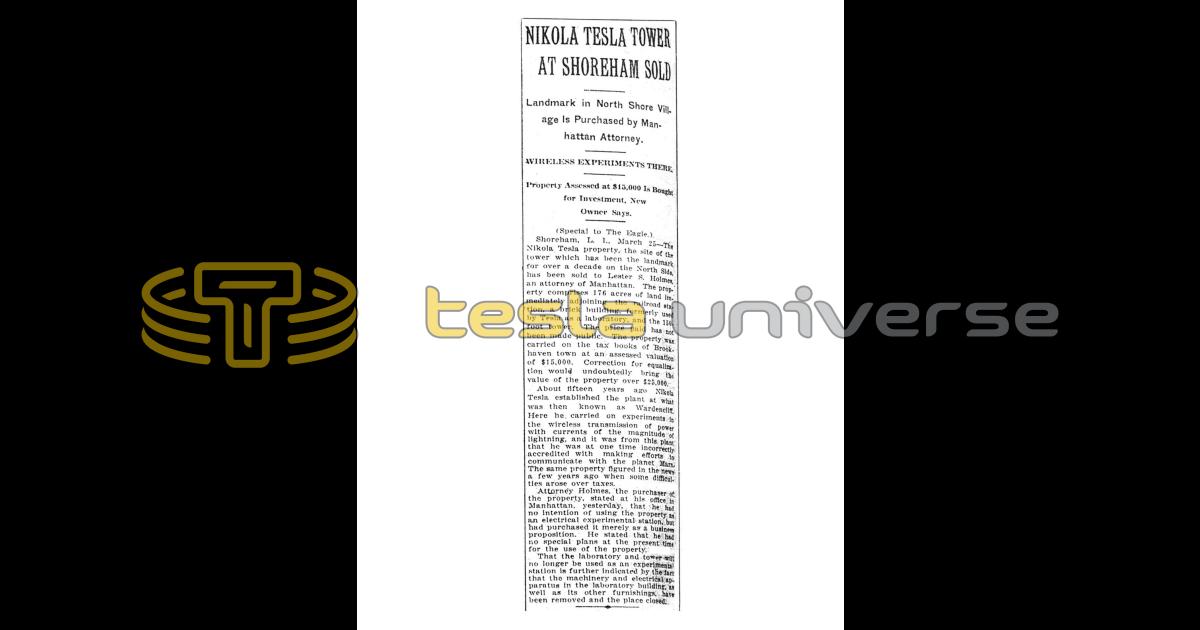 Shoreham, L. I.. March 25 — The Nikola Tesla property, the site of the tower which has been the landmark for over a decade on the North Side, has been sold to Lester S. Holmes, an attorney of Manhattan. The property comprises 176 acres of land immediately adjoining the railroad station, a brick building, formerly used by Tesla as a laboratory, and the 150. foot tower. The price paid has not been made public. The property was carried on the tax books of Brookhaven town at an assessed valuation of $15,000. Correction for equalization would undoubtedly bring the value of the property over $25,000.