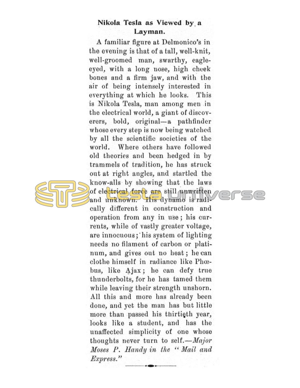 A familiar figure at Delmonico's in the evening is that of a tall, well-knit, well-groomed man, swarthy, eagle-eyed, with a long nose, high cheek bones and a firm jaw, and with the air of being intensely interested in everything at which he looks. This is Nikola Tesla, man among men in the electrical world, a giant of discoverers, bold, original - a pathfinder whose every step is now being watched by all the scientific societies of the world. Where others have followed old theories and been hedged in by trammels of tradition, he has struck out at right angles, and startled the know-alls by showing that the laws of electrical force are still unwritten and unknown. His dynamo is radically different in construction and operation from any in use; his currents, while of vastly greater voltage, are innocuous; his system of lighting needs no filament of carbon or platinum, and gives out no heat; he can clothe himself in radiance like Phoebus, like Ajax; he can defy true thunderbolts, for he has tamed them while leaving their strength unshorn. All this and more has already been done, and yet the man has but little more than passed his thirtieth year, looks like a student, and has the unaffected simplicity of one whose thoughts never turn to self.