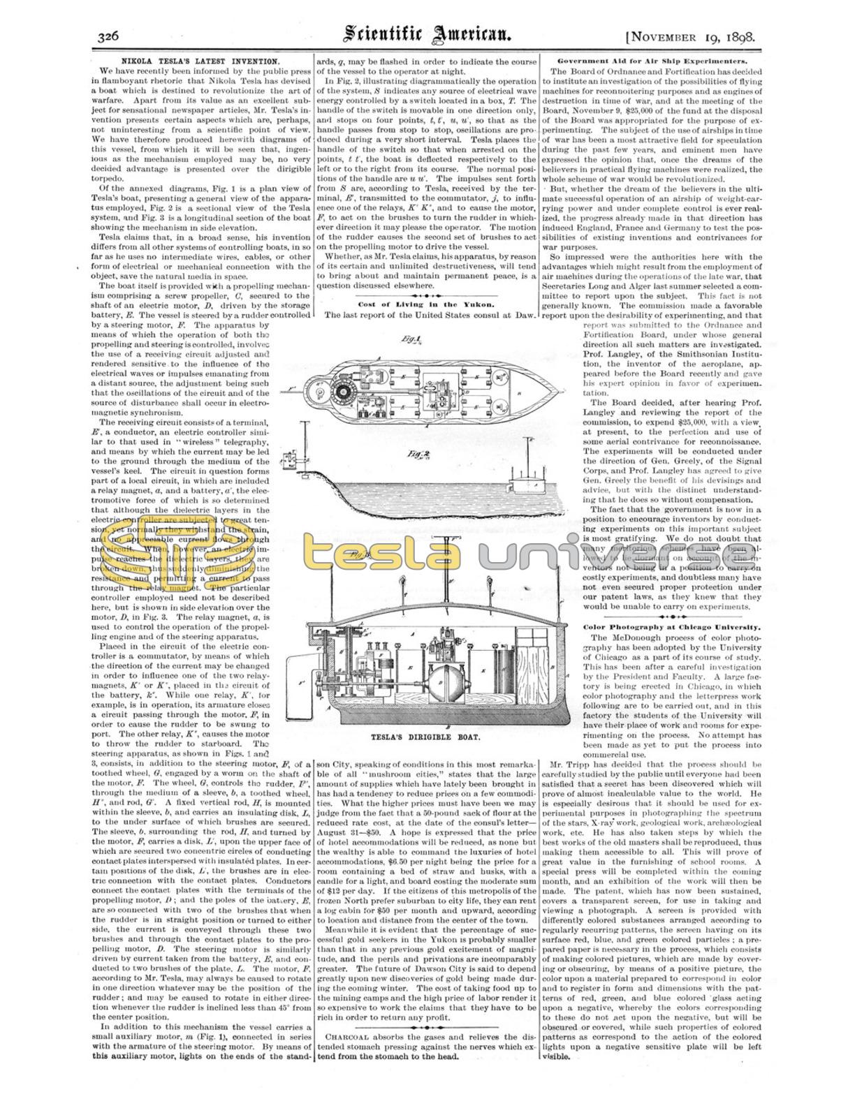 We have recently been informed by the public press in flamboyant rhetoric that Nikola Tesla has devised a boat which is destined to revolutionize the art of warfare. Apart from its value as an excellent subject for sensational newspaper articles, Mr. Tesla’s invention presents certain aspects which are, perhaps, not uninteresting from a scientific point of view. We have therefore produced herewith diagrams of this vessel, from which it will be seen that, ingenious as the mechanism employed may be, no very decided advantage is presented over the dirigible torpedo.