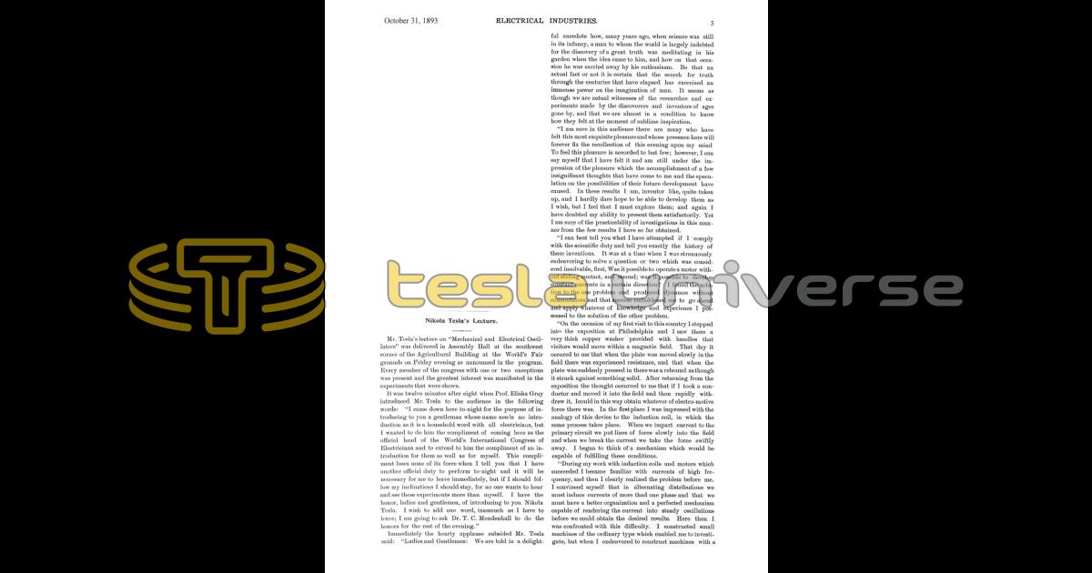 Mr. Tesla's lecture on "Mechanical and Electrical Oscillators" was delivered in Assembly Hall at the southwest corner of the Agricultural Building at the World's Fair grounds on Friday evening as announced in the program. Every member of the congress with one or two exceptions was present and the greatest interest was manifested in the experiments that were shown.